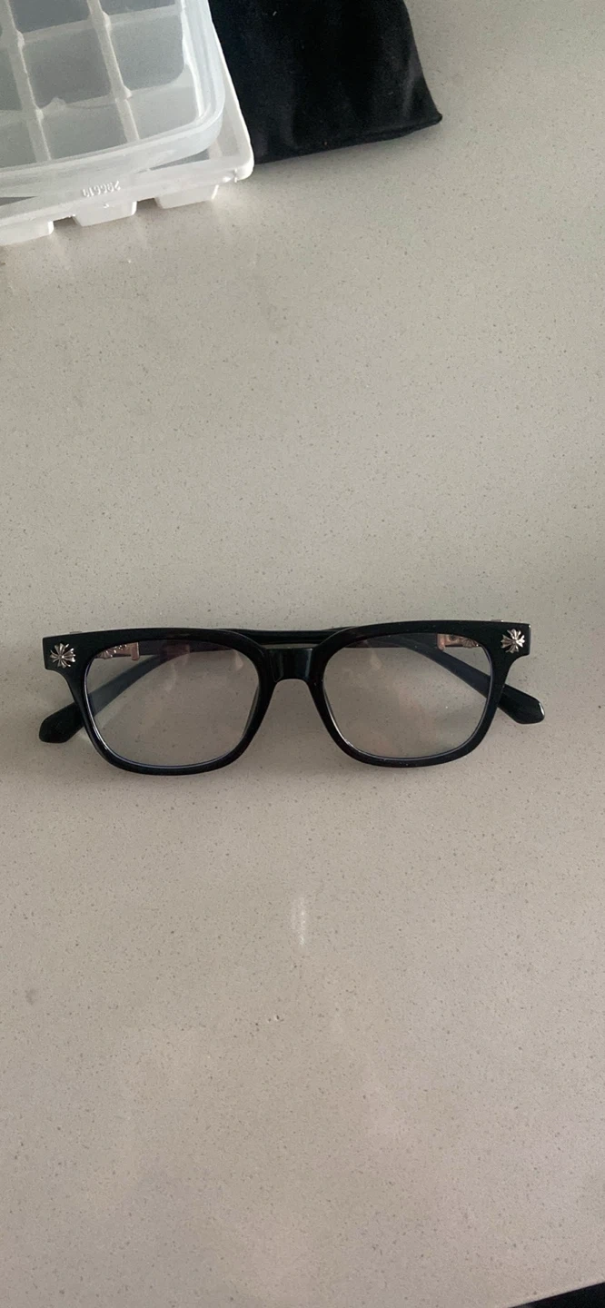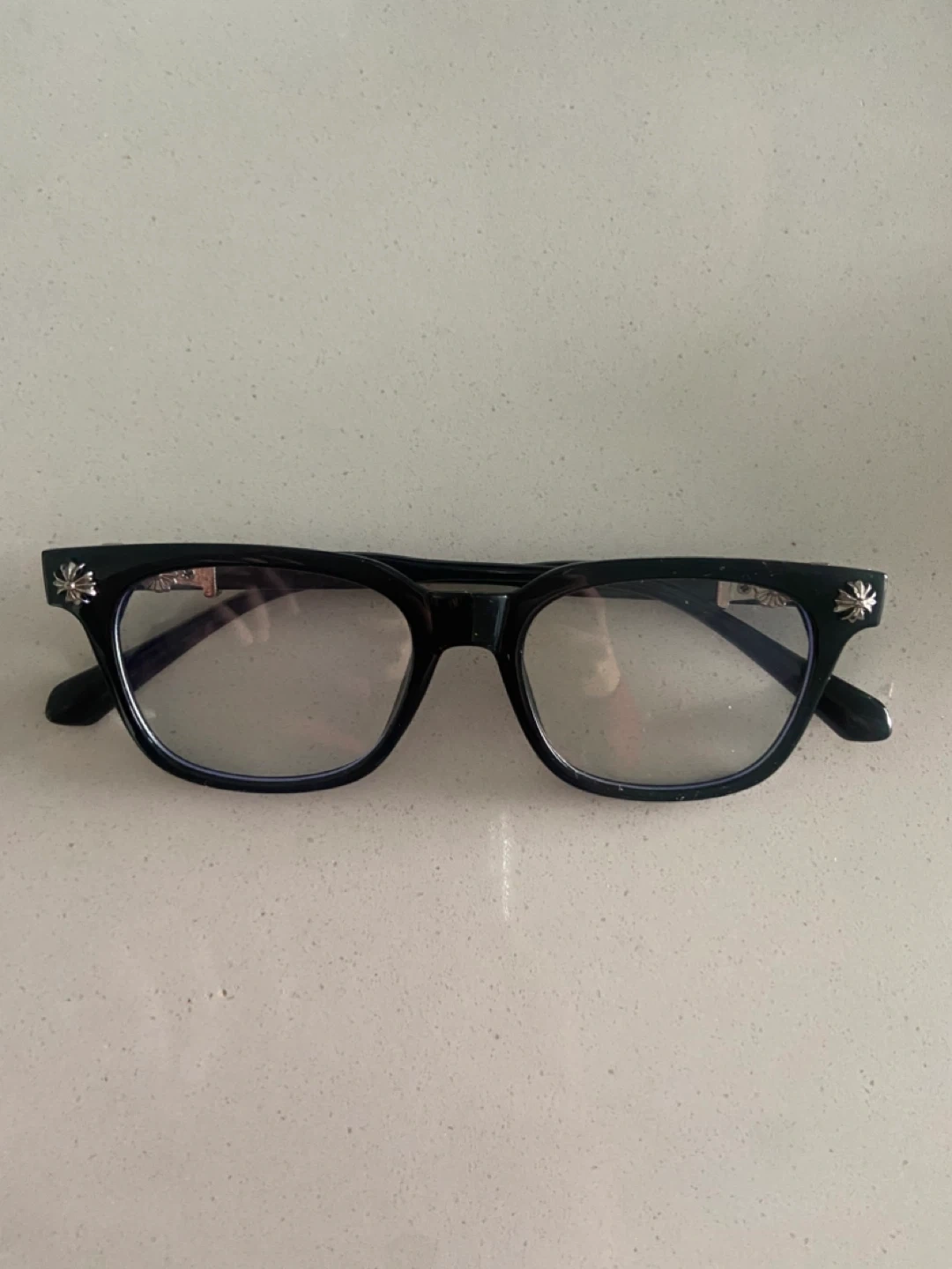 Selling a pair of blue light Chrome Hearts eyeglasses. They are in good condition and feature the signature Chrome Hearts design on the temples. A stylish accessory to complete your look!