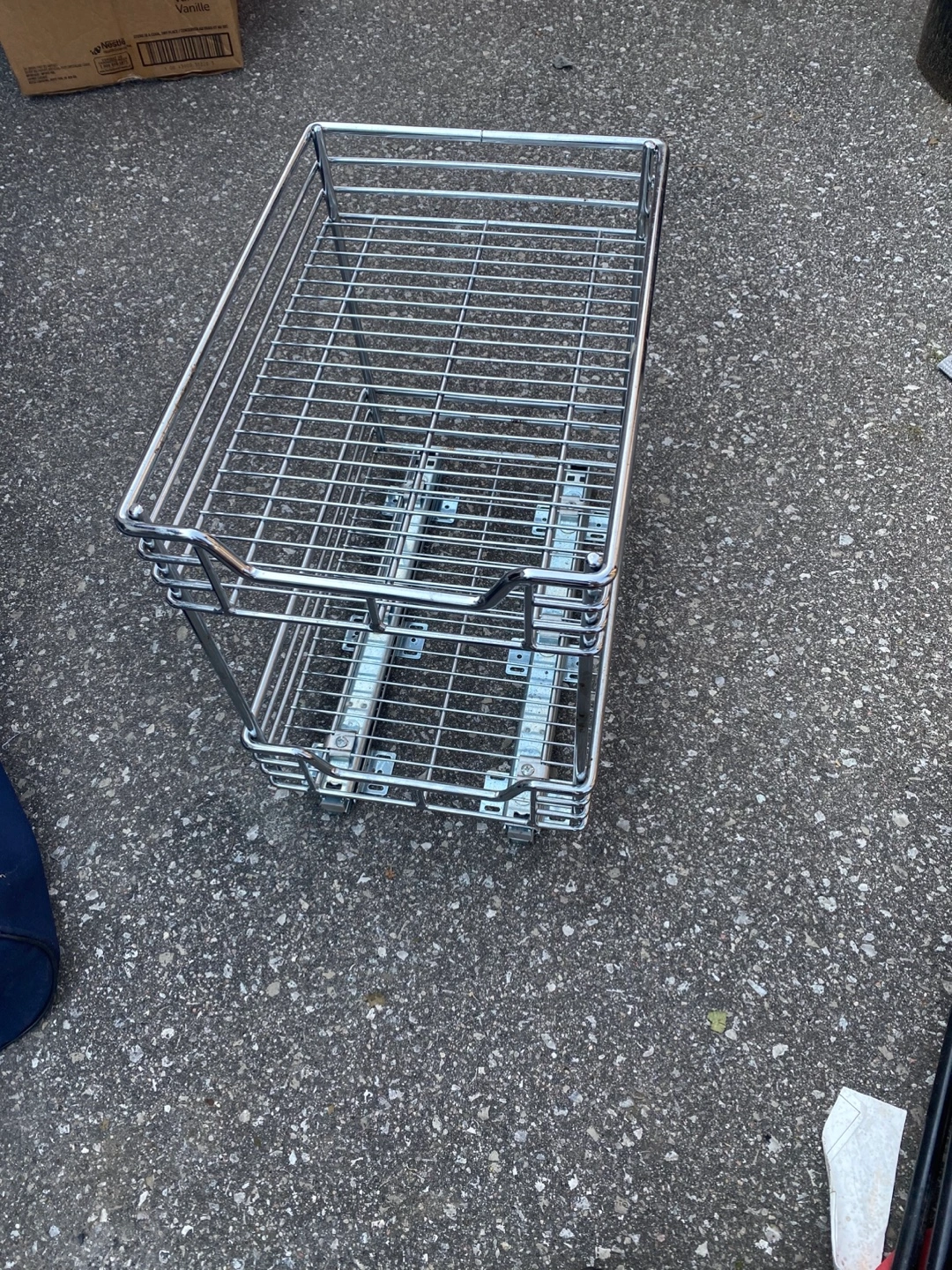 A chrome wire basket. Pull-out rails are attached. Consider adding it to your kitchen for easy storage.