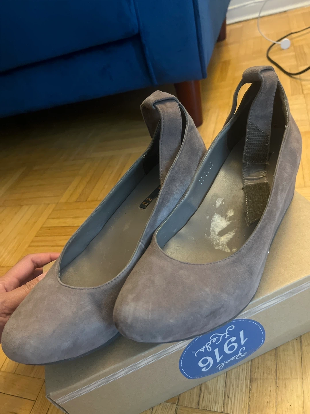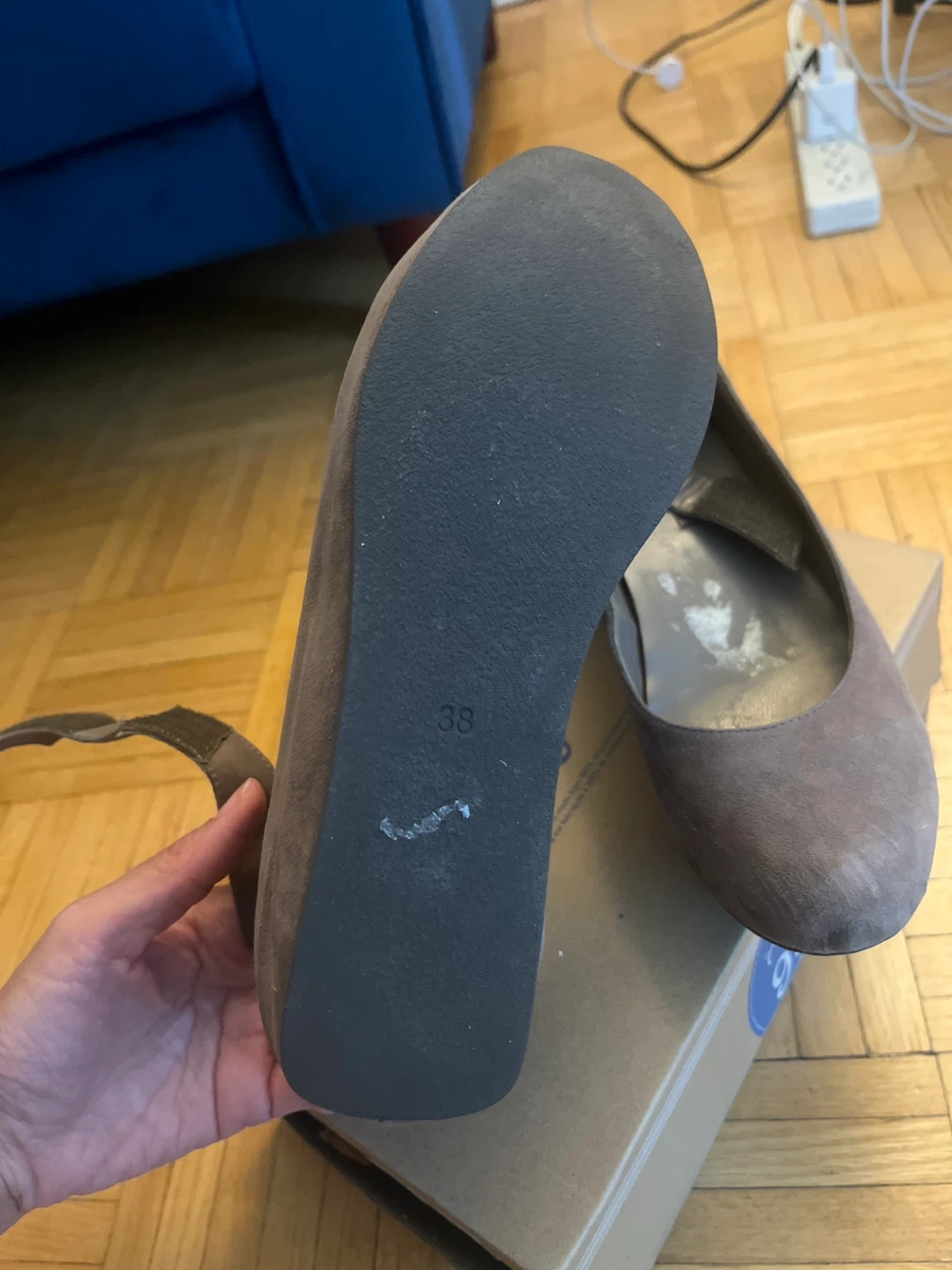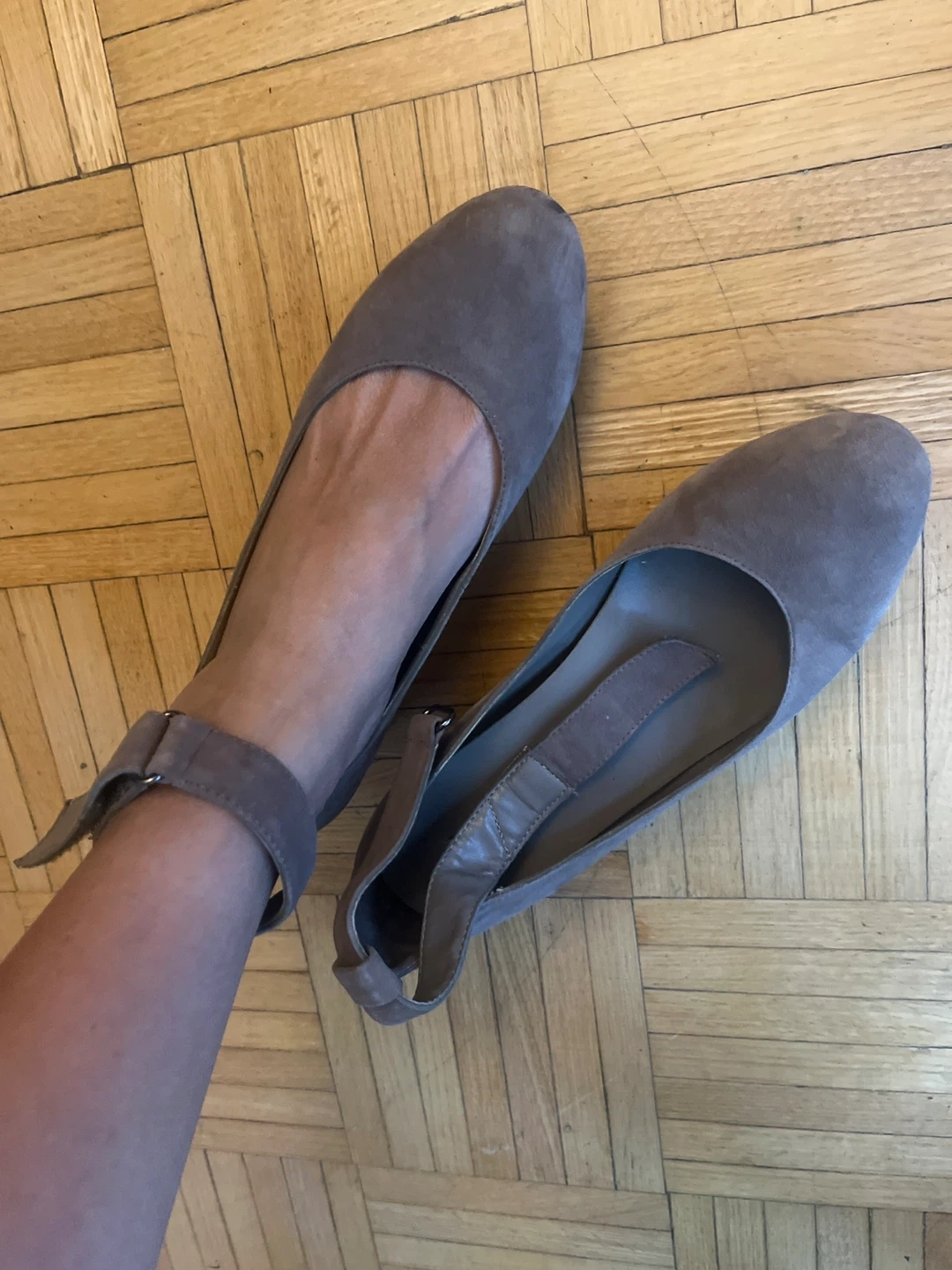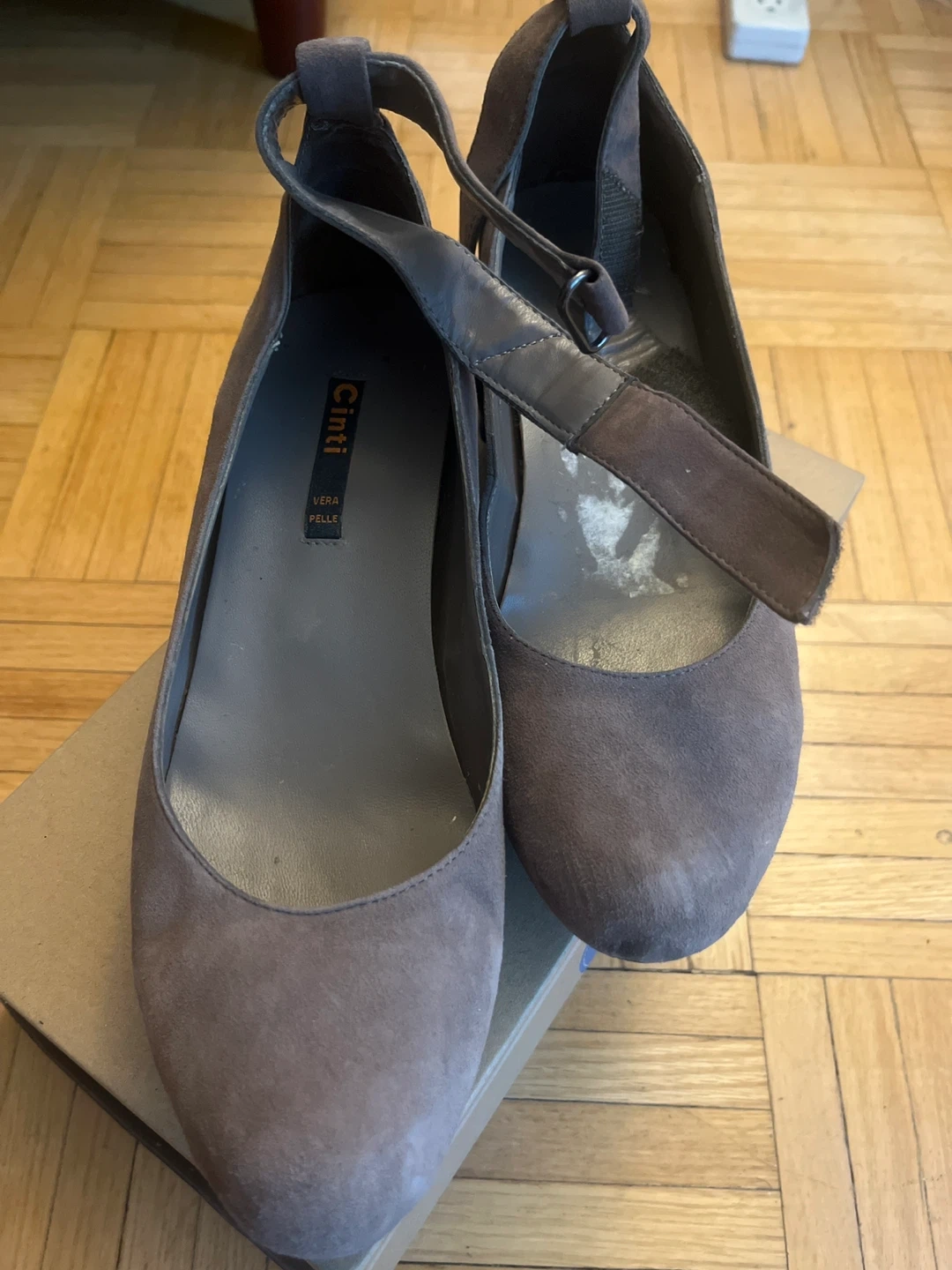 These are Cinti (Italian Brand) wedges in a soft, neutral suede. They feature an ankle strap for a secure and stylish fit. The size is 38.
