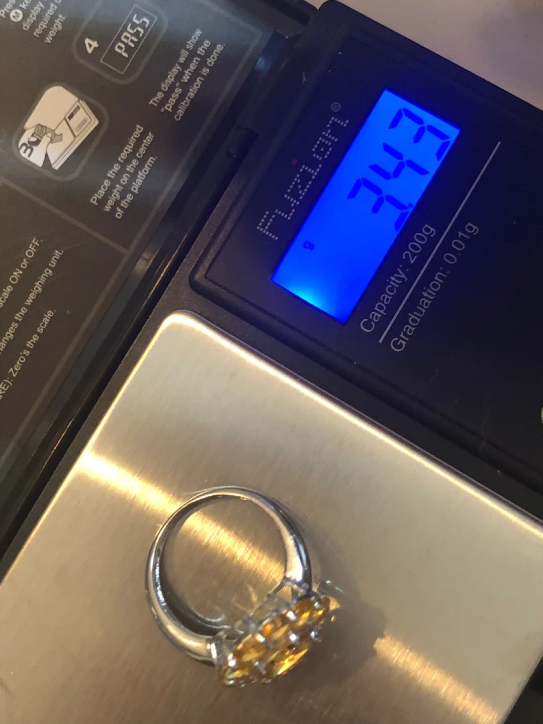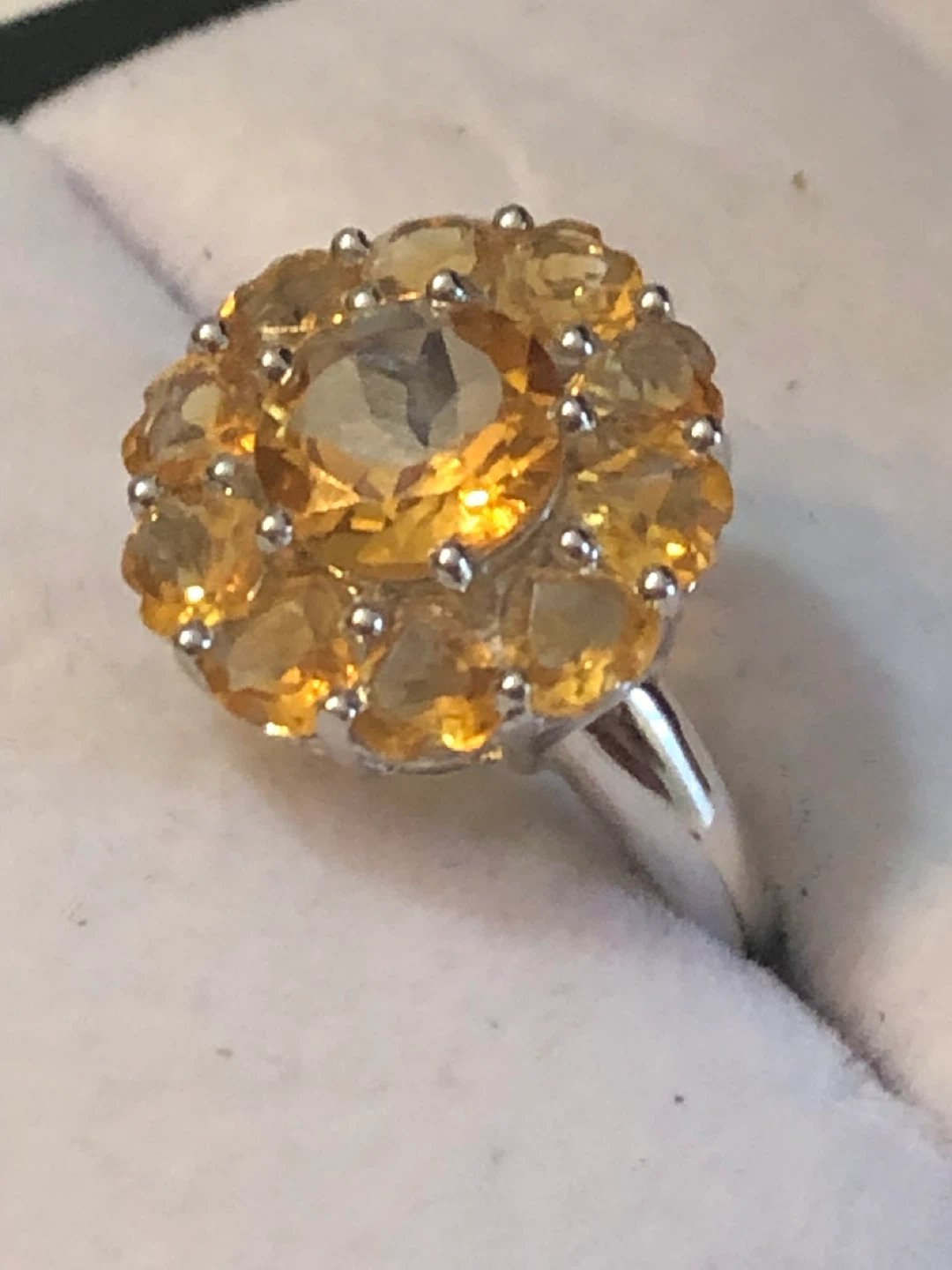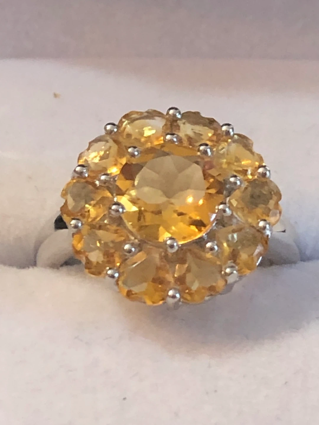 Beautiful citrine ring , 10k sokid white gold .. It has a lovely floral design with a larger central stone surrounded by smaller citrine stones. A unique and eye-catching piece!