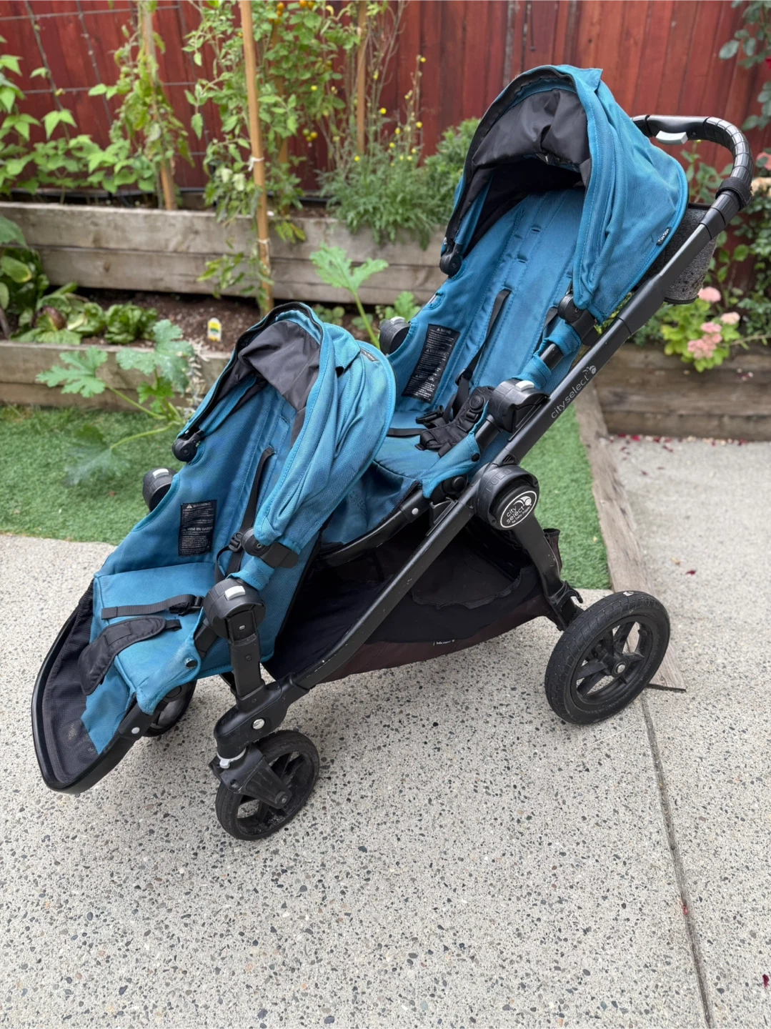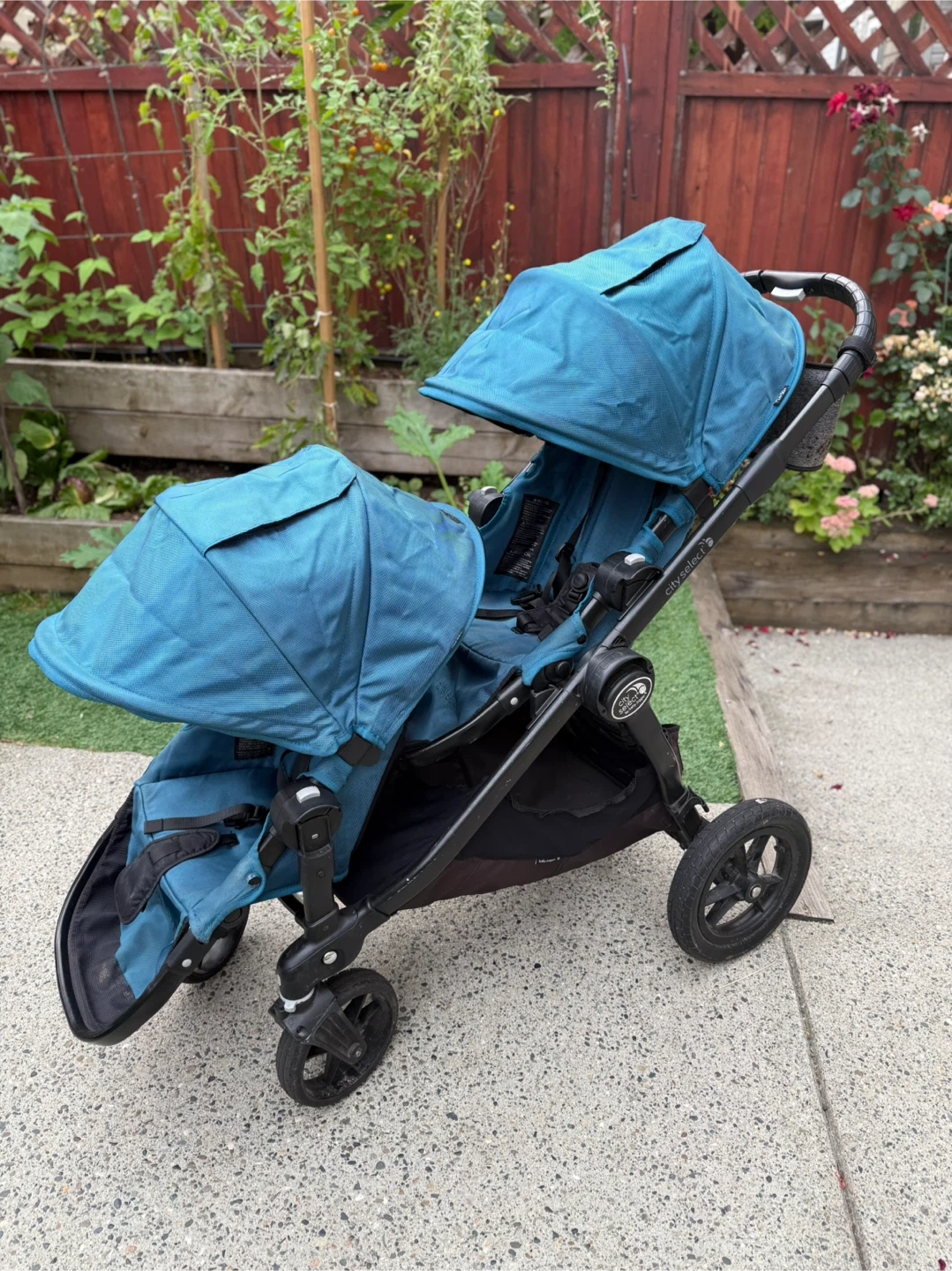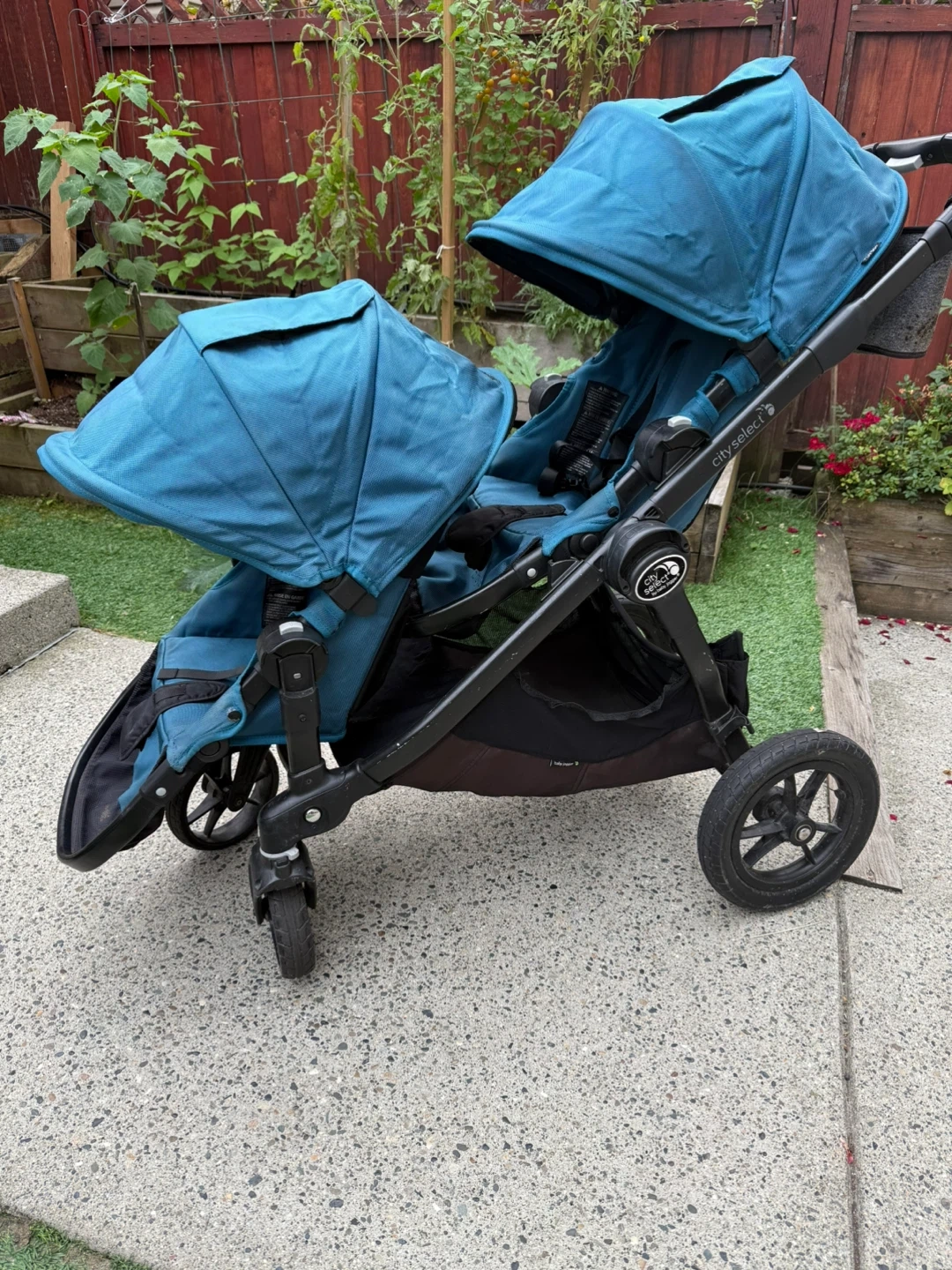 Selling a City Select double stroller by Baby Jogger in teal. It's in great condition and ready for a new family! Perfect for growing families or those with twins. This stroller is known for its versatility and smooth ride. It has worked so great for our family. One side of the basket underneath has been fixed up because the attachments came off but otherwise everything is in working order and functional. Parent console included as well as an extra.