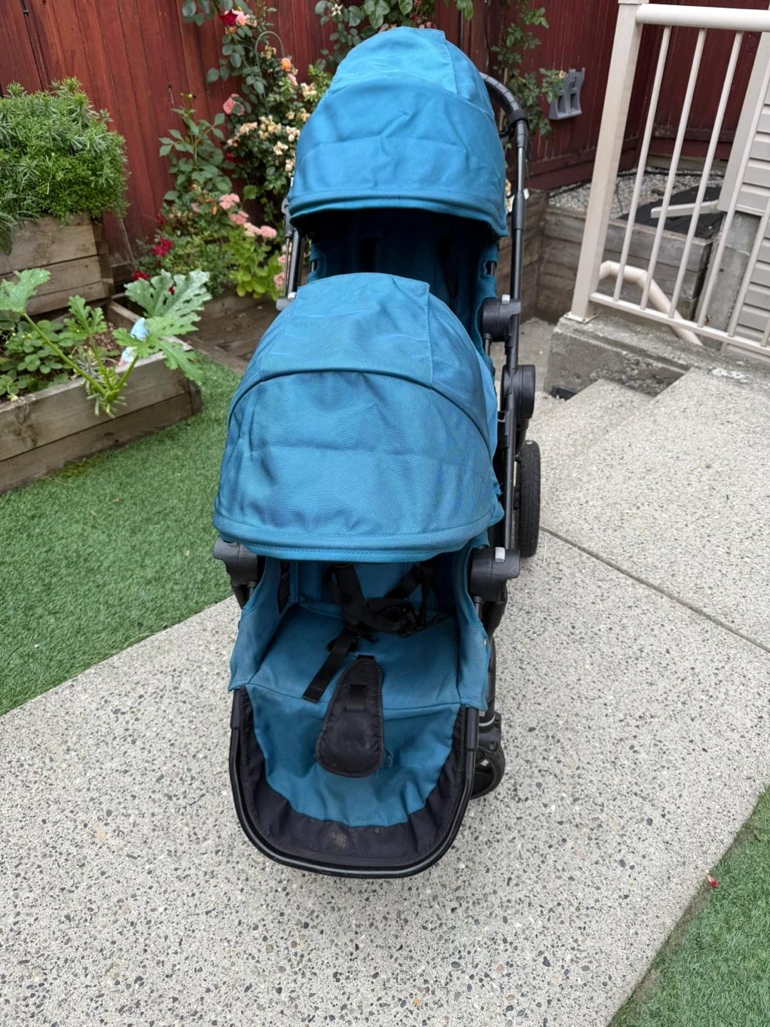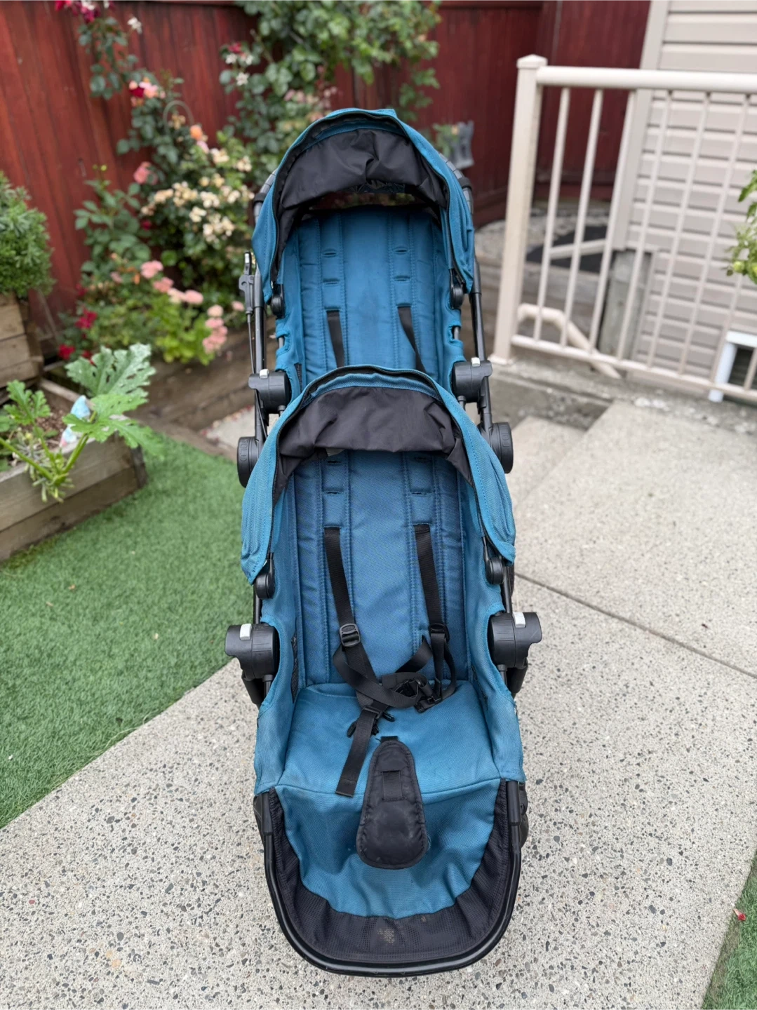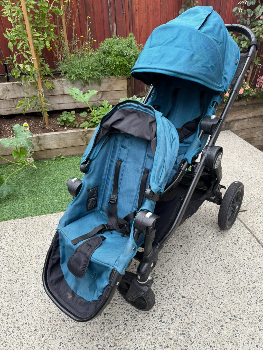 Selling a City Select double stroller by Baby Jogger in teal. It's in great condition and ready for a new family! Perfect for growing families or those with twins. This stroller is known for its versatility and smooth ride. It has worked so great for our family. One side of the basket underneath has been fixed up because the attachments came off but otherwise everything is in working order and functional. Parent console included as well as an extra.
