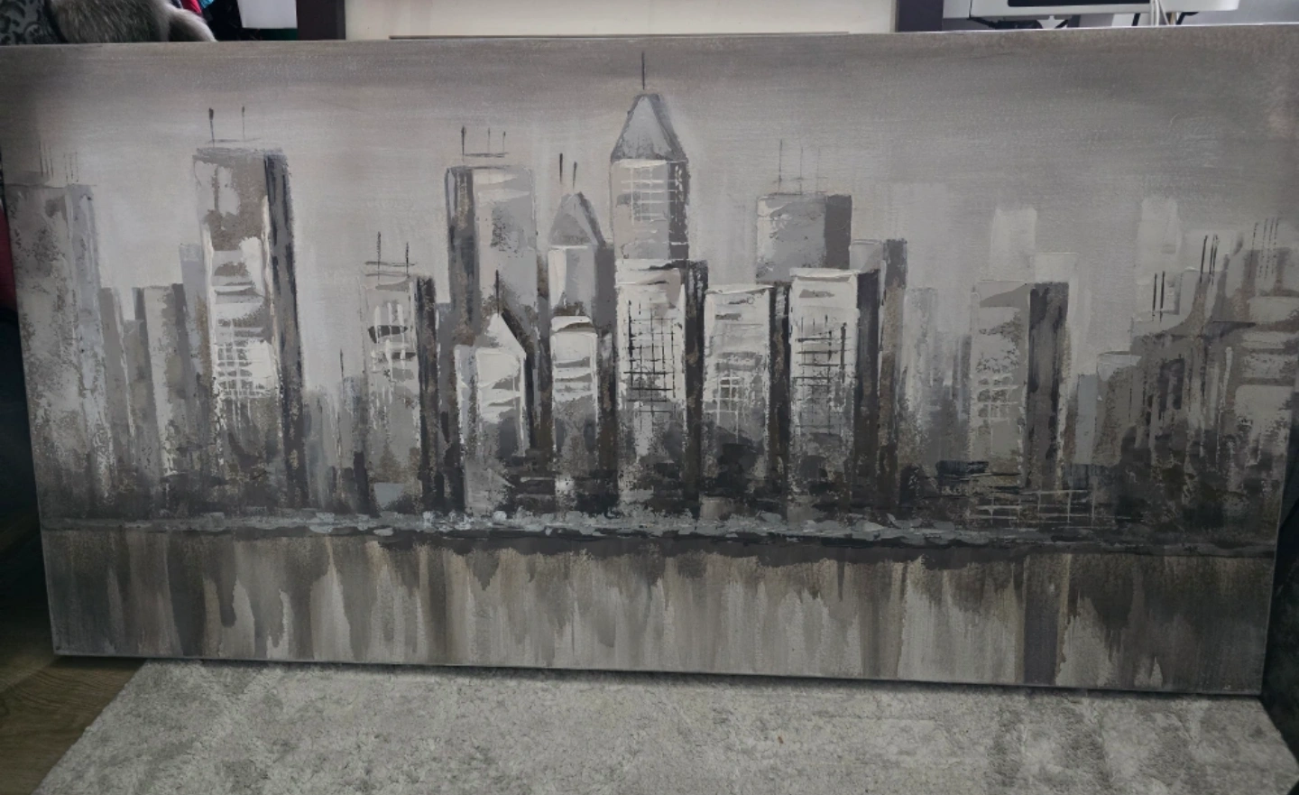 This is a beautiful piece of wall art featuring a cityscape in shades of greys. It comes on a canvas and would be perfect for adding a modern touch to any room. Structube l, originally $200+ Smoke Free home.