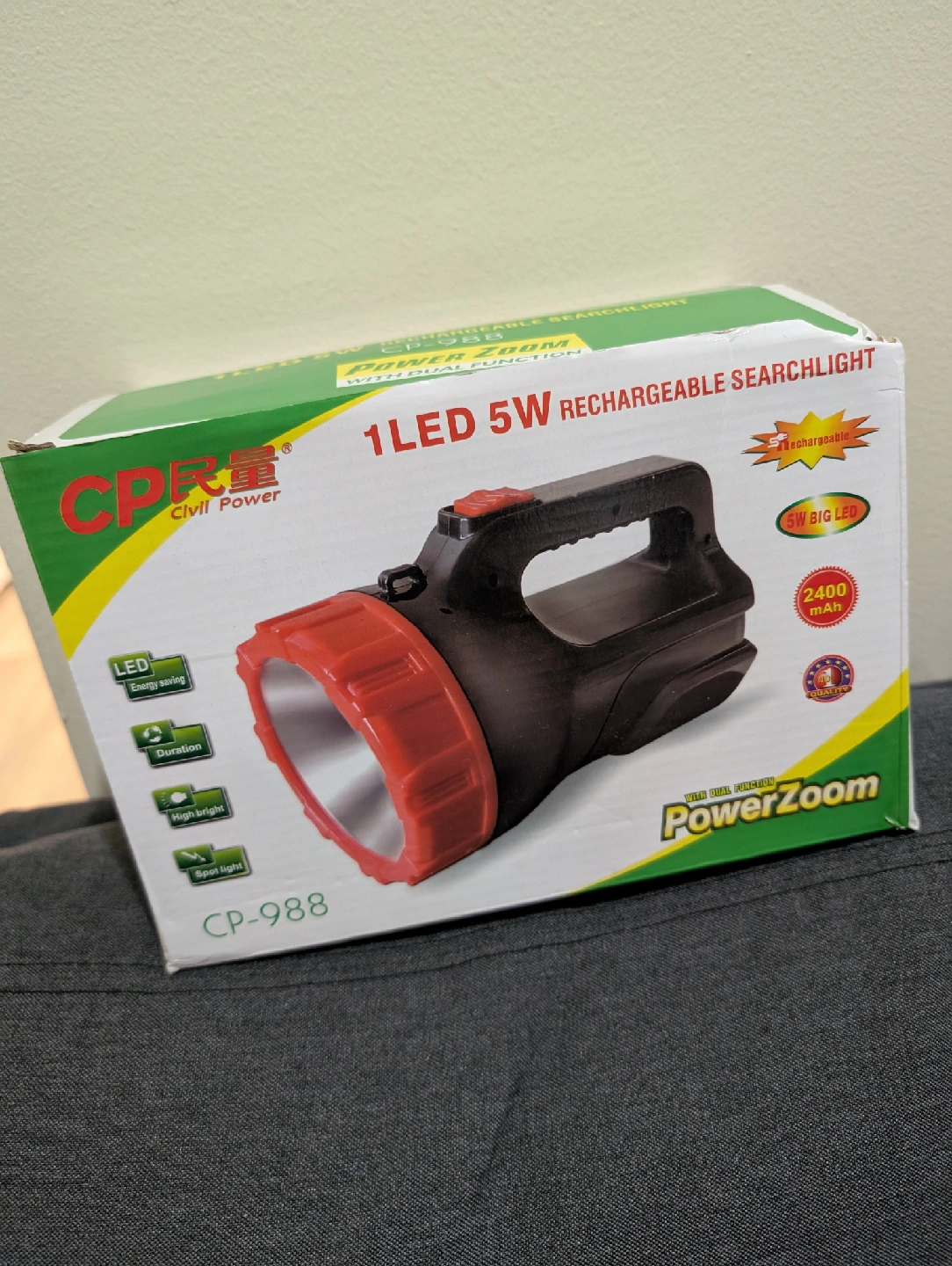 Selling a Civil Power CP-988 rechargeable searchlight. It features 1 LED 5W, Power Zoom with dual function, and a 5W big LED. It has a 2400 mAh battery and is rechargeable!