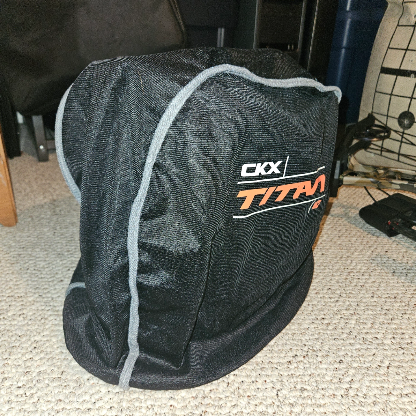 Black CKX Titan modular snowmobile helmet. Includes yellow tinted goggles. Comes with a carrying bag. Minor wear and tear.