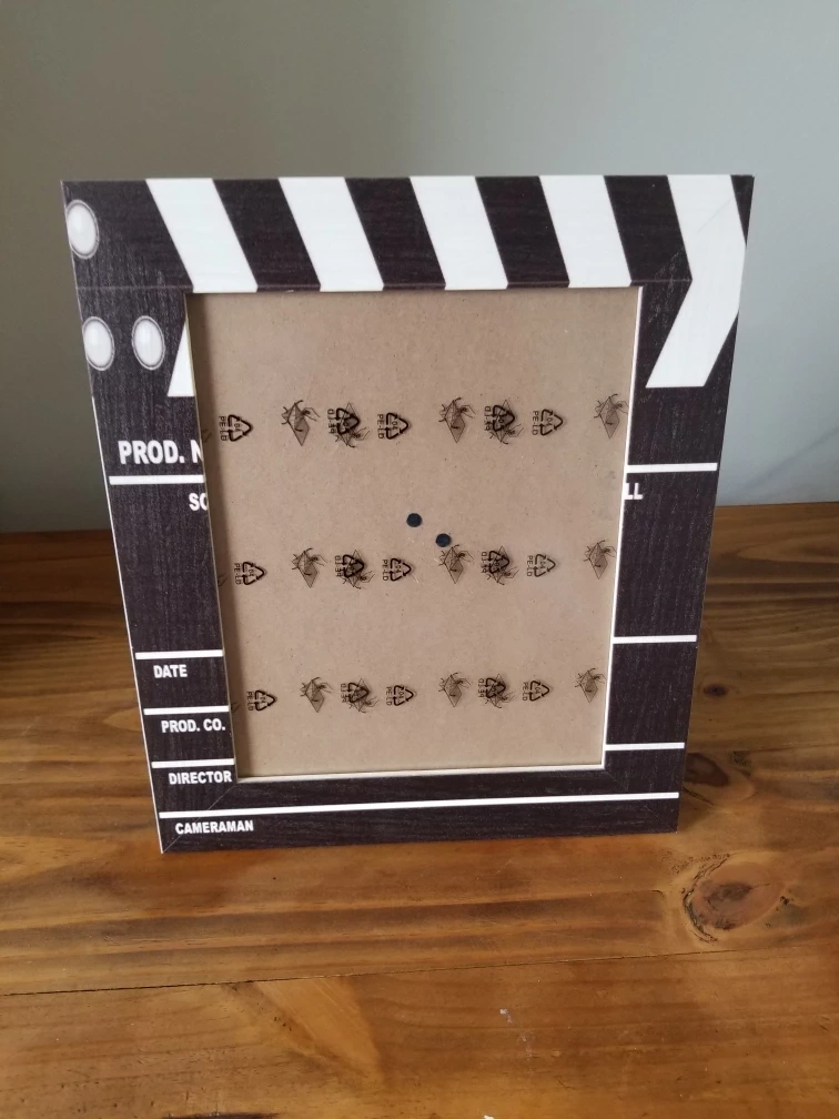 Here's a fun picture frame styled like a clapboard! It's perfect for adding a touch of movie magic to any room. It has a stand on the back so it can sit on a table or shelf. The frame is in great condition and ready for your favourite photo! Brand new 8x12