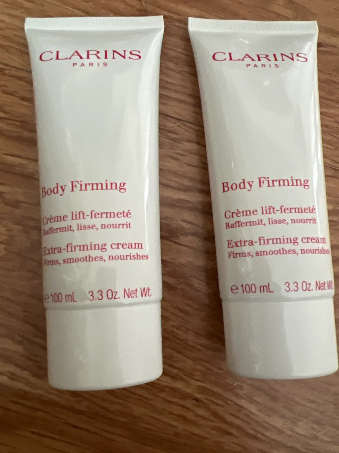 Two Clarins Body Firming Extra-Firming Cream. It comes in a 100ml (3.3 Oz Net Wt.) tube. This cream firms, smoothes, and nourishes the skin. Perfect for keeping your skin looking its best!