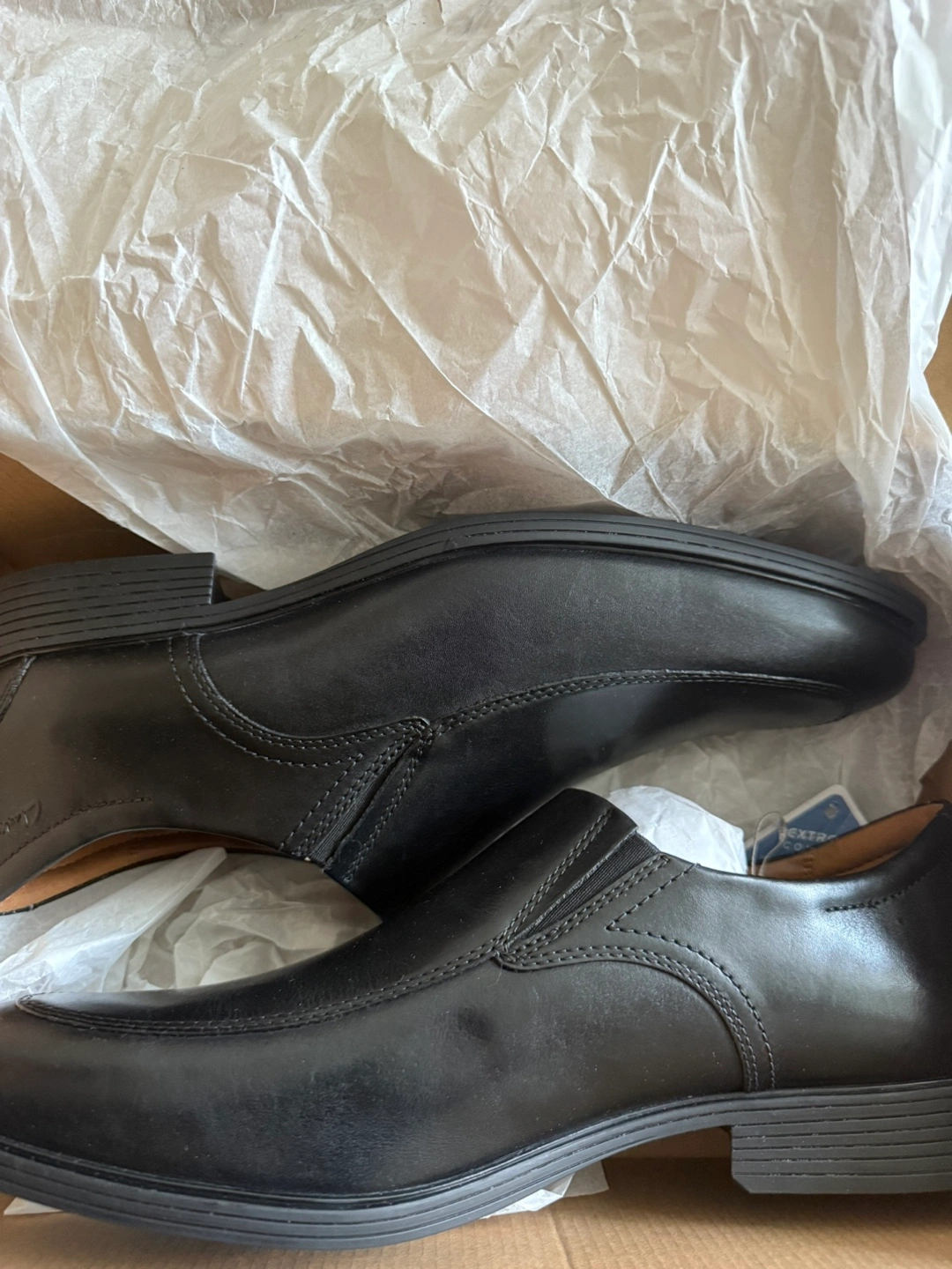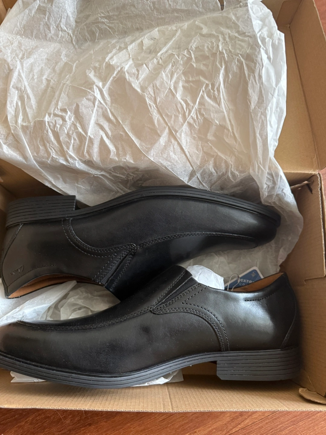 A lovely pair of leather dress shoes. They appear to be in a box. These shoes would be great to relax in after a long day.