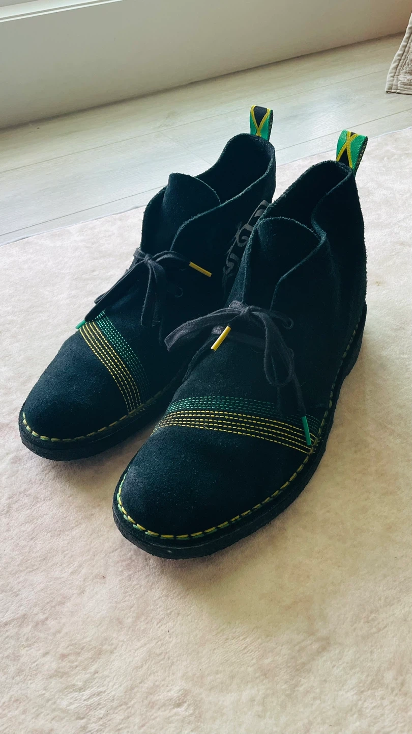 Selling a pair of Clarks Originals desert boots. They are black suede with green and yellow accents. Great condition!