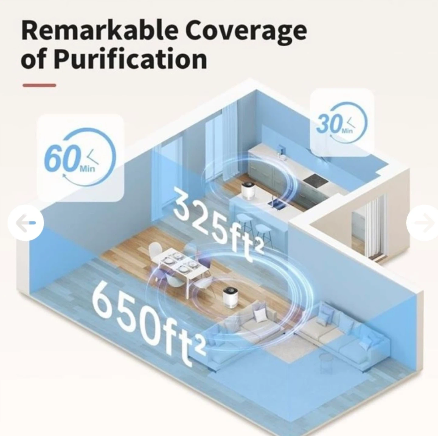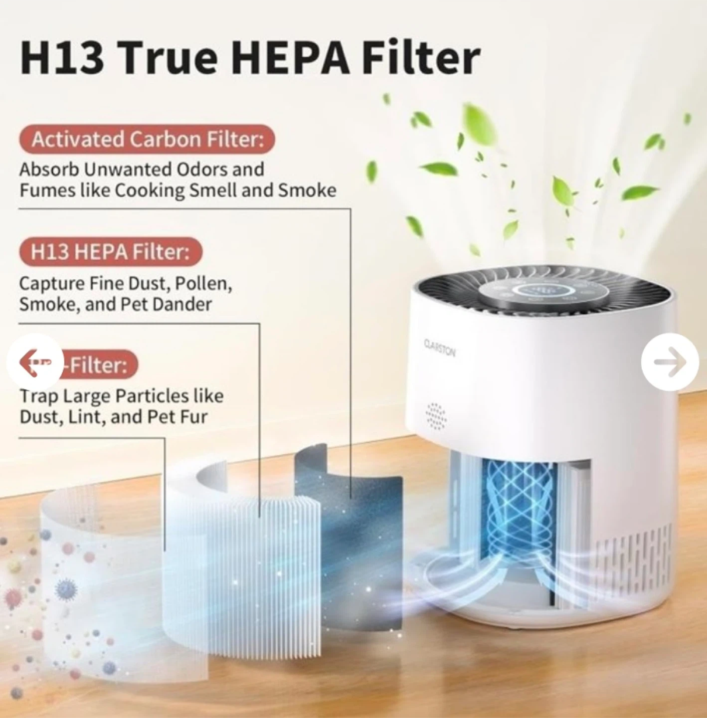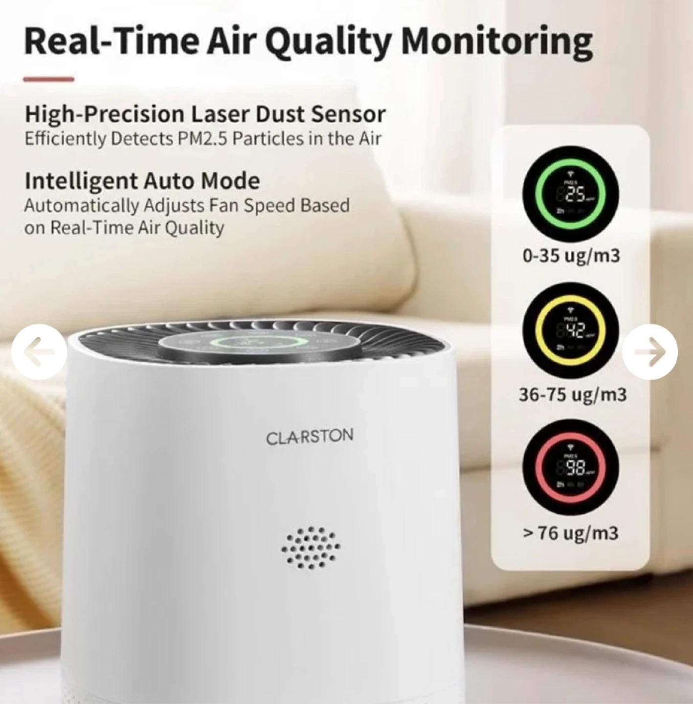 Selling a Clarston Air Purifier, model KJ100F. It's new condition and comes with the original box. It features real-time air quality monitoring with a high-precision laser dust sensor that efficiently detects PM2.5 particles in the air. The intelligent auto mode automatically adjusts the fan speed based on real-time air quality. It also has an activated carbon filter to absorb unwanted odours and fumes, and an H13 HEPA filter to capture fine dust, pollen, smoke, and pet dander