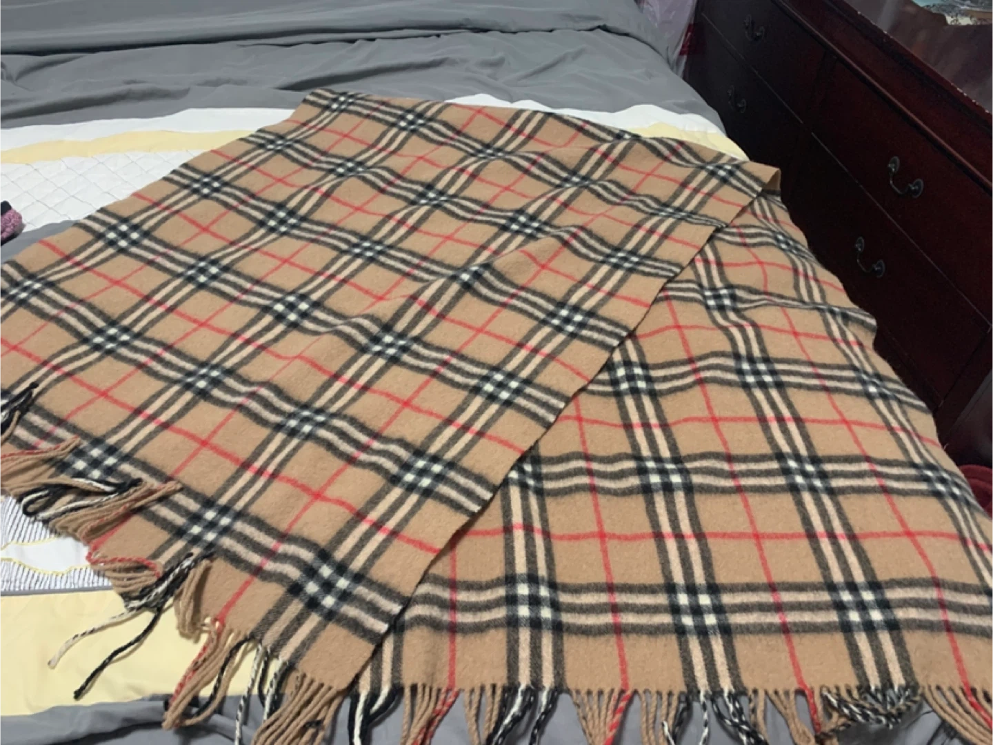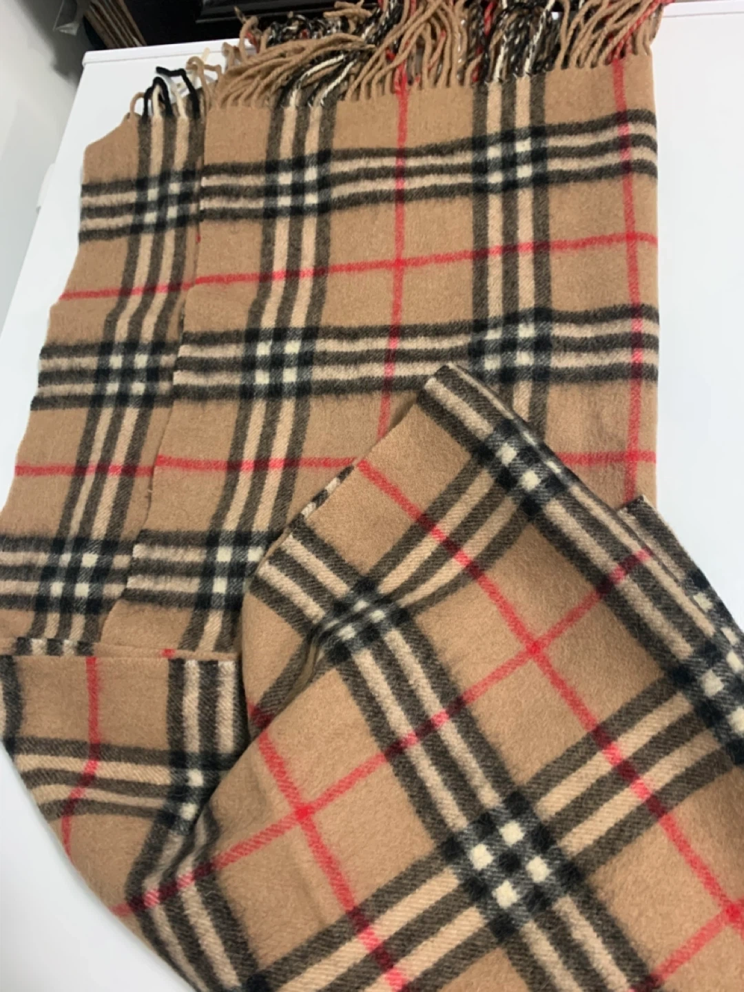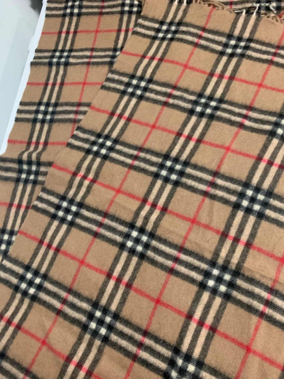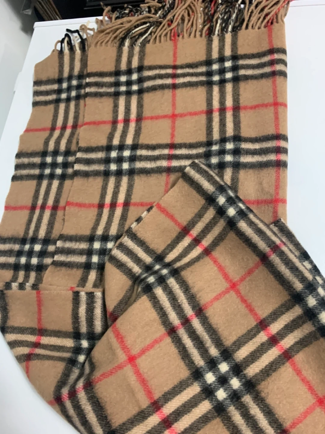 Selling a scarf with the iconic check pattern! It's in great condition and perfect for adding a touch of style to any outfit. The scarf features plaid in beige, black, and red. A timeless piece to keep you warm and fashionable!No label care(my daughter misplaced the label care when it came off),no box.