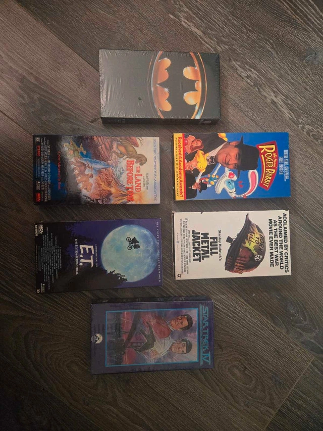 Dive into nostalgia with these classic VHS tapes, including titles like Batman (still sealed!), E.T. the Extra-Terrestrial, The Land Before Time, Who Framed Roger Rabbit, Full Metal Jacket, and Star Trek IV. These vintage tapes are in good condition, ready to bring back movie night memories. Considering the rarity and condition of these tapes, especially the sealed Batman VHS, $60 for the lot. Batman (Sealed) $25.00 E.T. the Extra-Terrestrial $10.00 The Land Before Time $10.00 Who Framed Roger Rabbit $10.00 Full Metal Jacket $10.00 Star Trek IV (Sealed) $10.00 If this ad is still up, then yes, the tapes are still available, ready and waiting for a new home. Don't miss out on owning a piece of cinematic history!