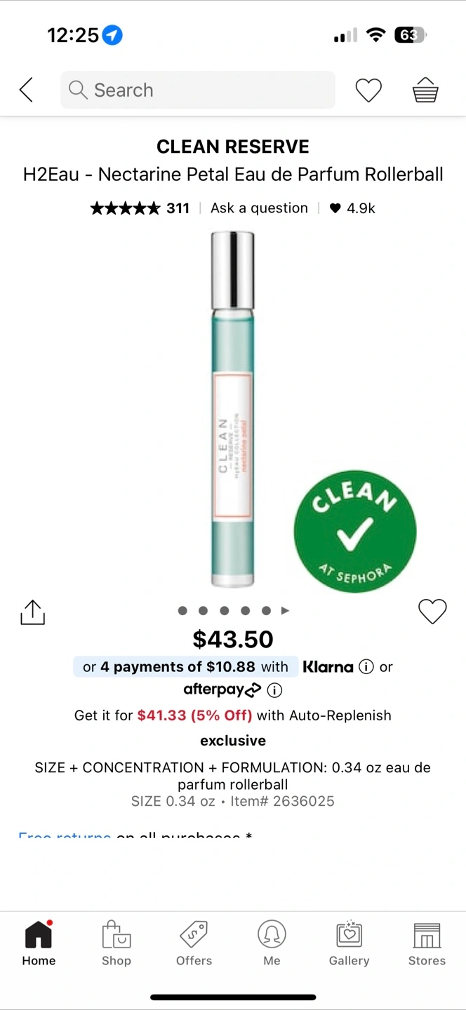 Clean Reserve H2O Eau de Parfum Rollerball. Nectarine Petal scent. 0.34 oz. Travel-sized rollerball. Retails for $43.50 +tax