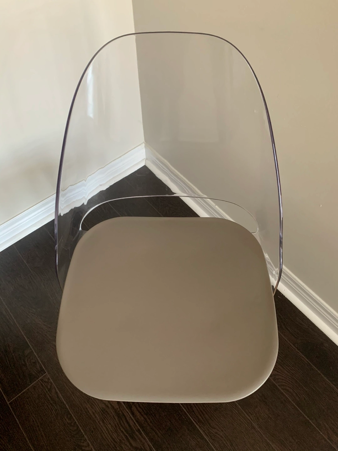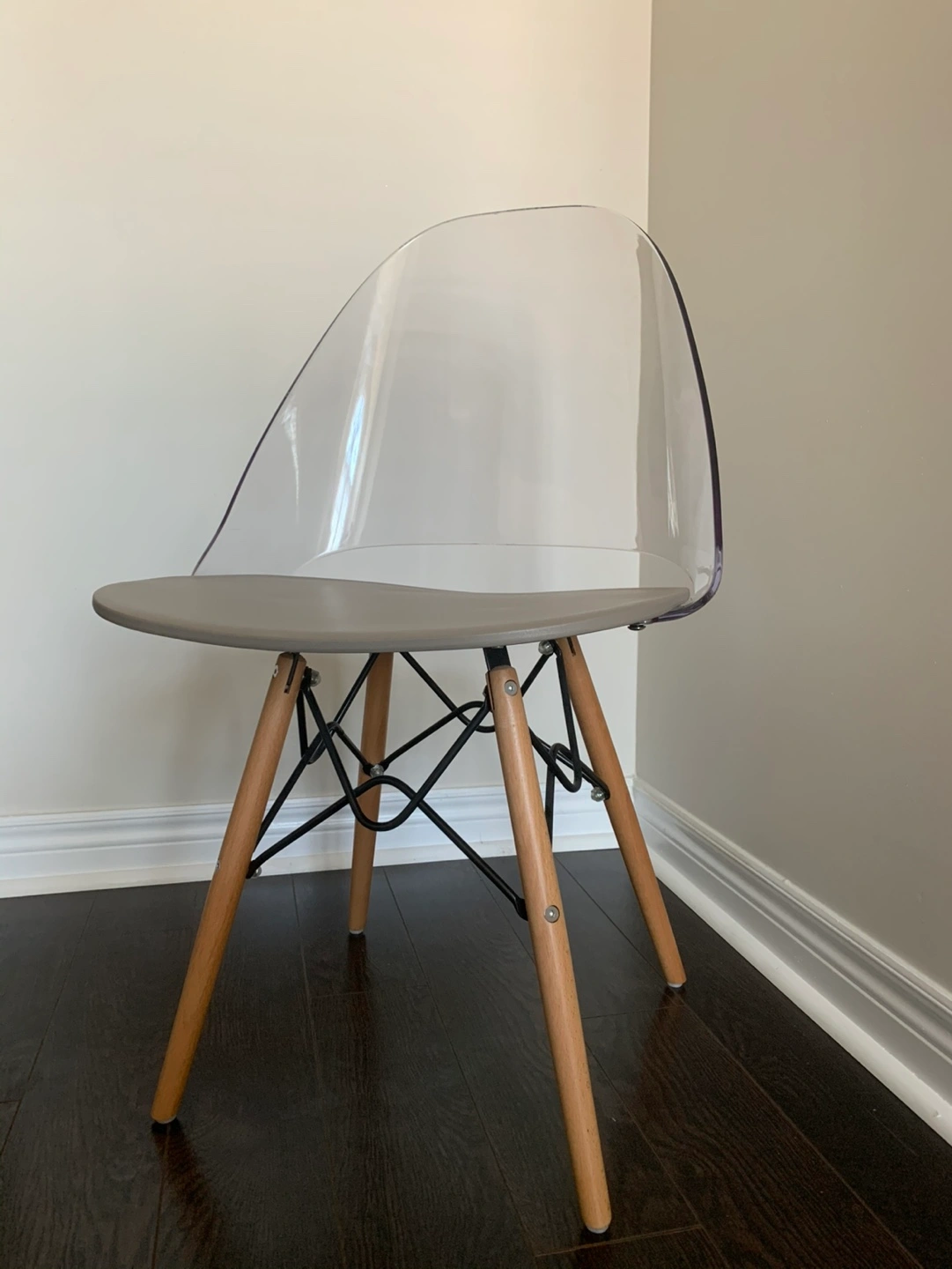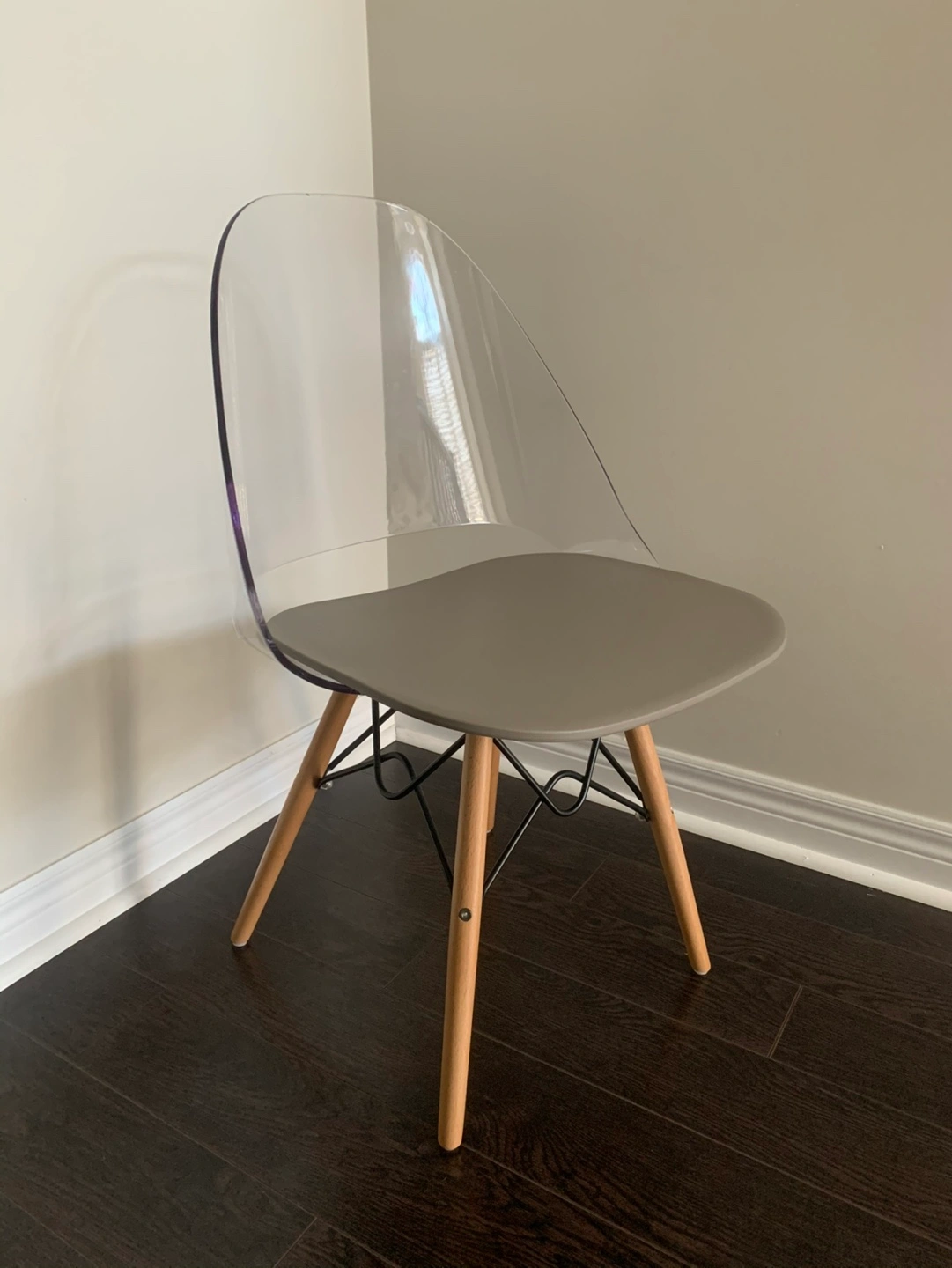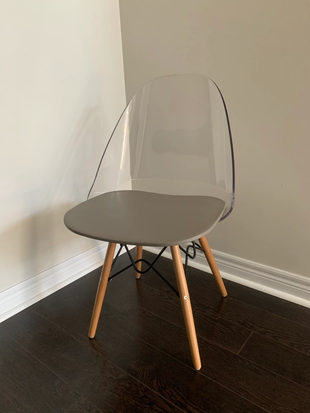 Modern design chair. Clear acrylic back and grey seat. Wooden legs. Stylish, sturdy and comfortable. Purchased for $148 on Walmart.ca. Reason for selling: initially bought as a stylish office chair but got gifted a new chair shortly after, didn’t end up using this one. Features -Can be used as a dining chair or office chair -Meets or exceeds all North American safety standards -Eco-Friendly: Yes -Minimum desk height chair will fit under: 25" Product Details -Weight Capacity: 250 lb. Main Material: Plastic / Acrylic -Leg Material: Manufactured Wood Size: -Overall: 32.5'' H x 19.29'' W x 16.25'' D -Seat: 17.52'' H x 15.25'' W x 16.25'' D Sold fully assembled