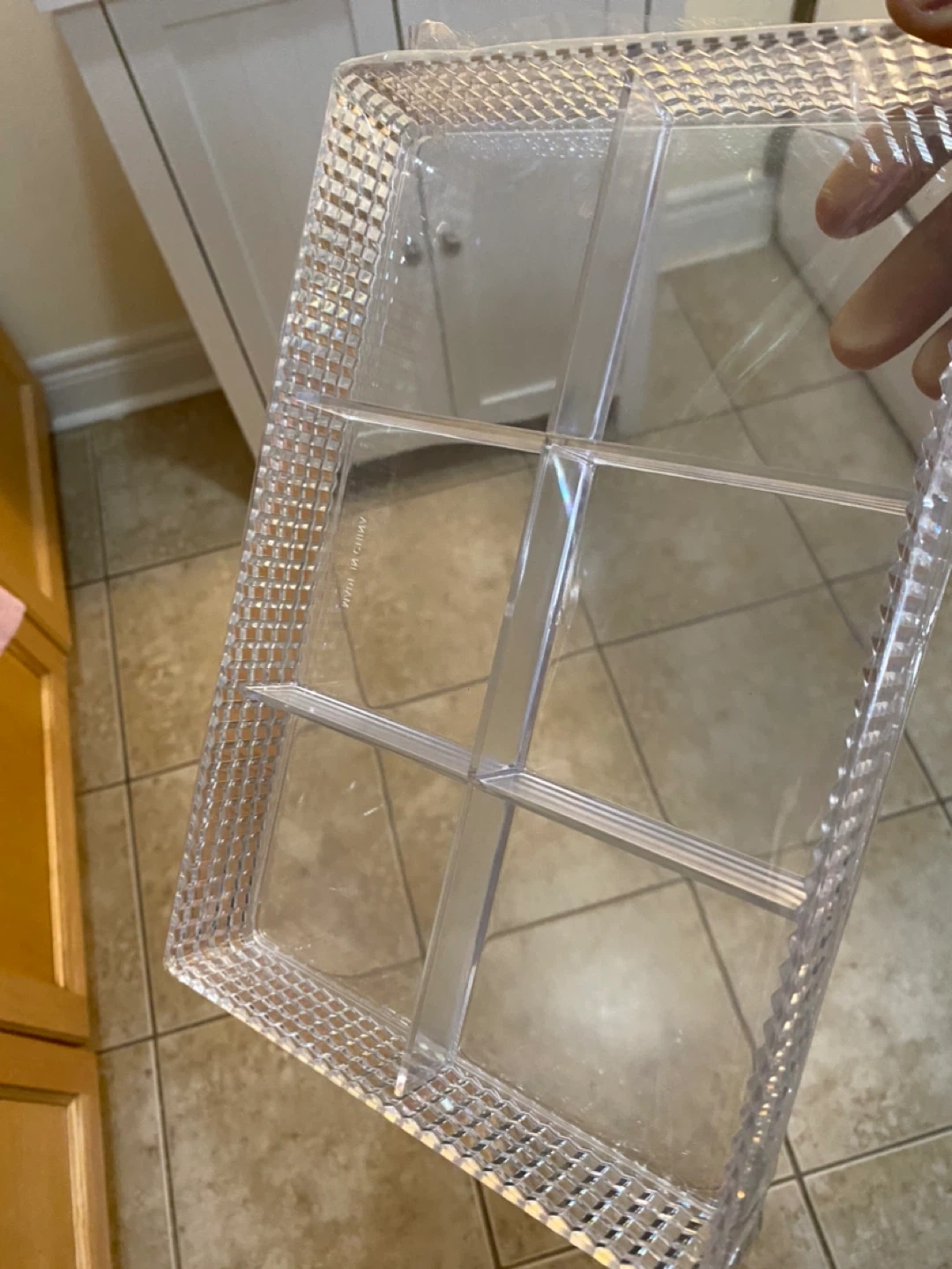 Selling a clear acrylic organizer tray! It's perfect for keeping your items neat and tidy. It has a nice design around the edges and dividers to make organization easy