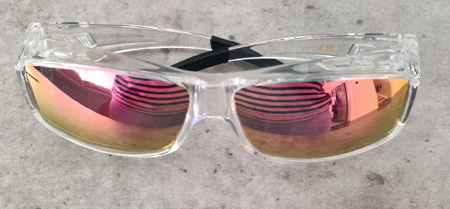 Selling a pair of sunglasses with clear frames and rose-tinted lenses. They're brand new but ready for a new owner since I don't need it and return window is gone.