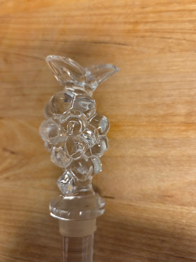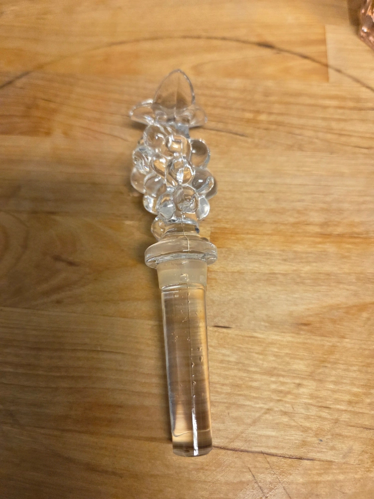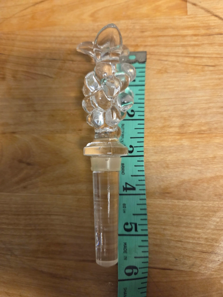 Here's a clear glass bottle stopper, perfect for keeping your favourite beverages fresh! It's in great condition and ready for a new home. The stopper measures about 5 inches in length.