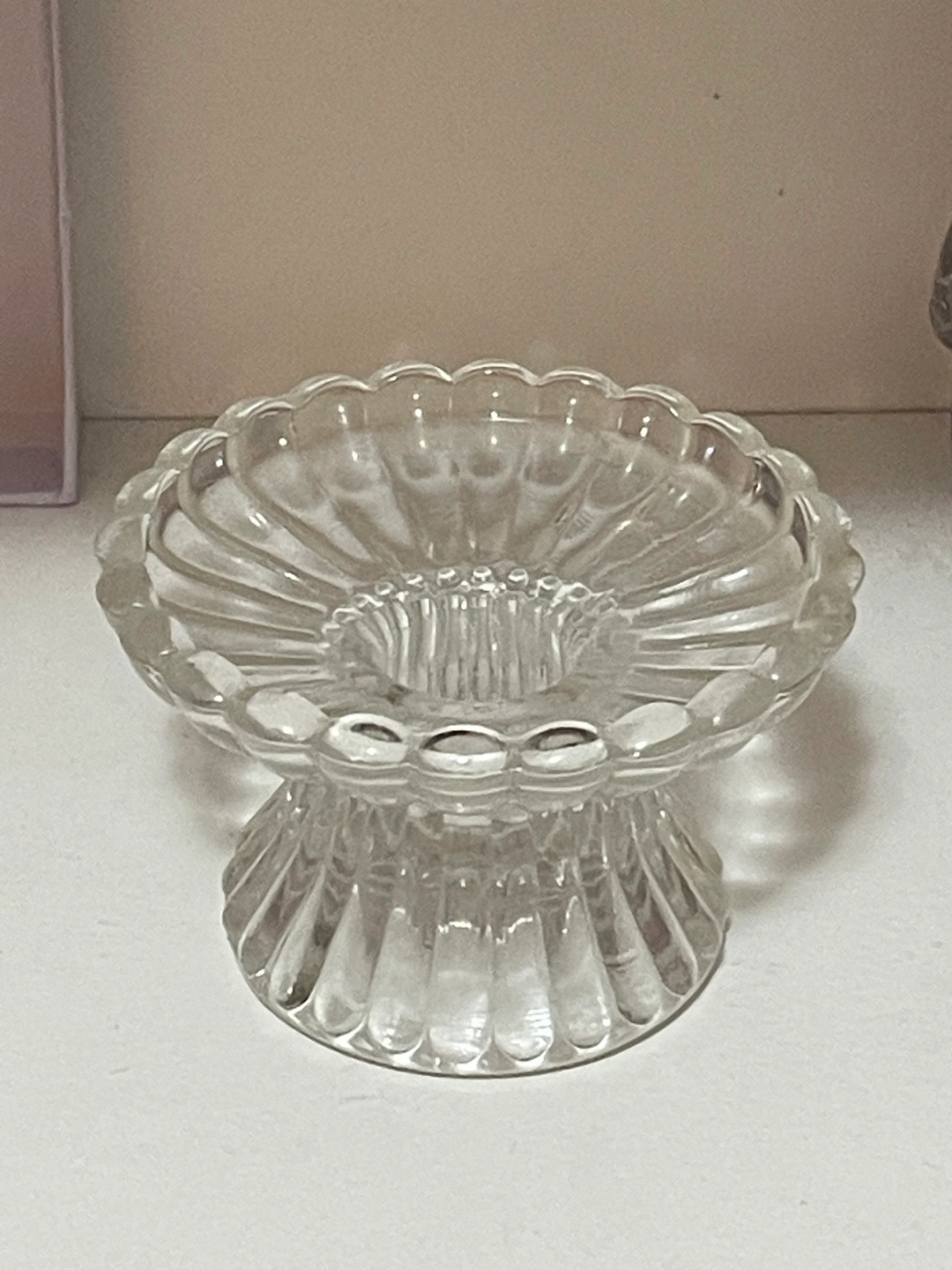 Selling a clear glass candle holder. It's in great shape and ready to add a touch of elegance to your space! It has a beautiful design that would look lovely on any table or shelf I have 2 of them.