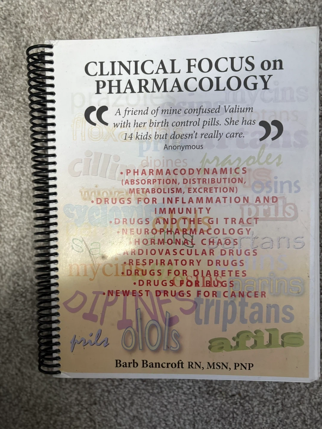 Selling a textbook titled 'Clinical Focus on Pharmacology' by Barb Bancroft RN, MSN, PNP. It covers topics like pharmacodynamics, drugs for inflammation, and respiratory drugs. Great for students in pharmacology or related fields!
