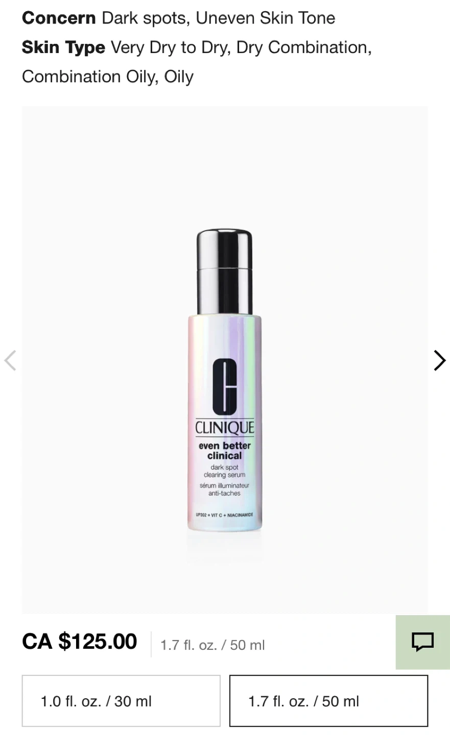 Selling a Clinique Even Better Clinical Radical Dark Spot Corrector + Interrupter. It's a 1.7 fl oz / 50 ml bottle. Originally bought for $125 CA. It targets dark spots and uneven skin tone, suitable for very dry to oily skin types