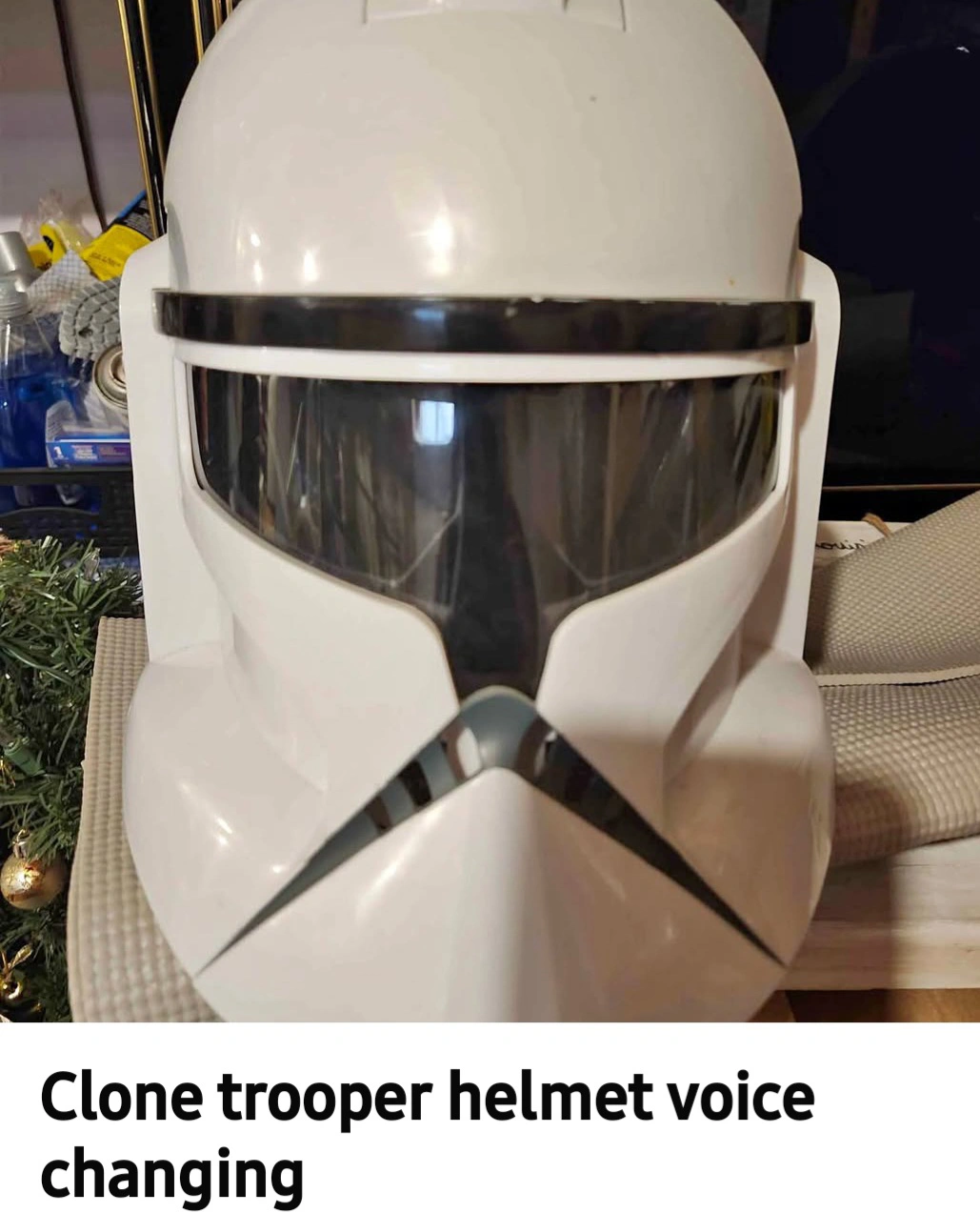 Selling a Clone Trooper helmet that changes your voice! It's in great condition and ready for a new owner who loves Star Wars