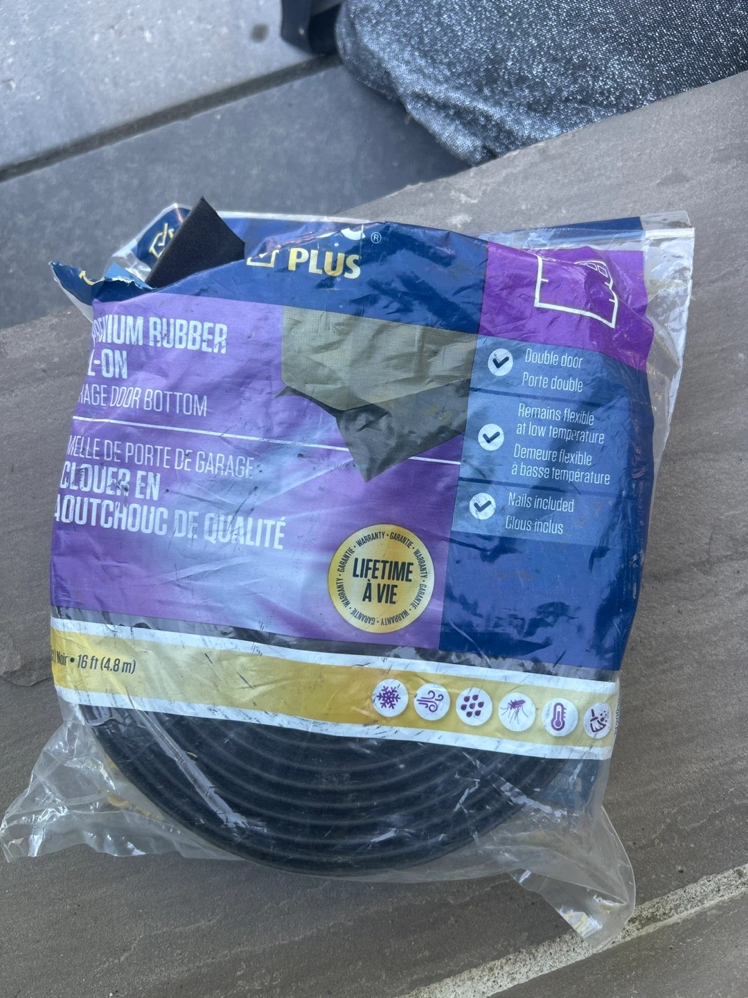 Selling a Clopay garage door bottom weather seal. It's made of premium rubber and is designed for double doors. It remains flexible even at low temperatures and comes with nails included. The seal is 16 ft (4.8 m) long
