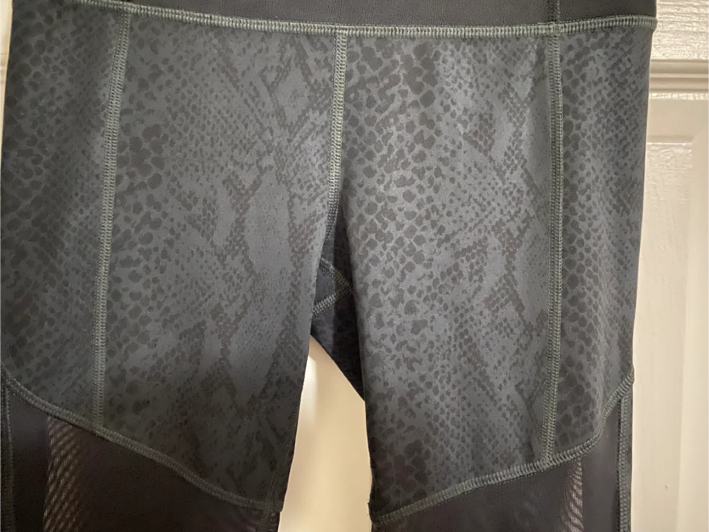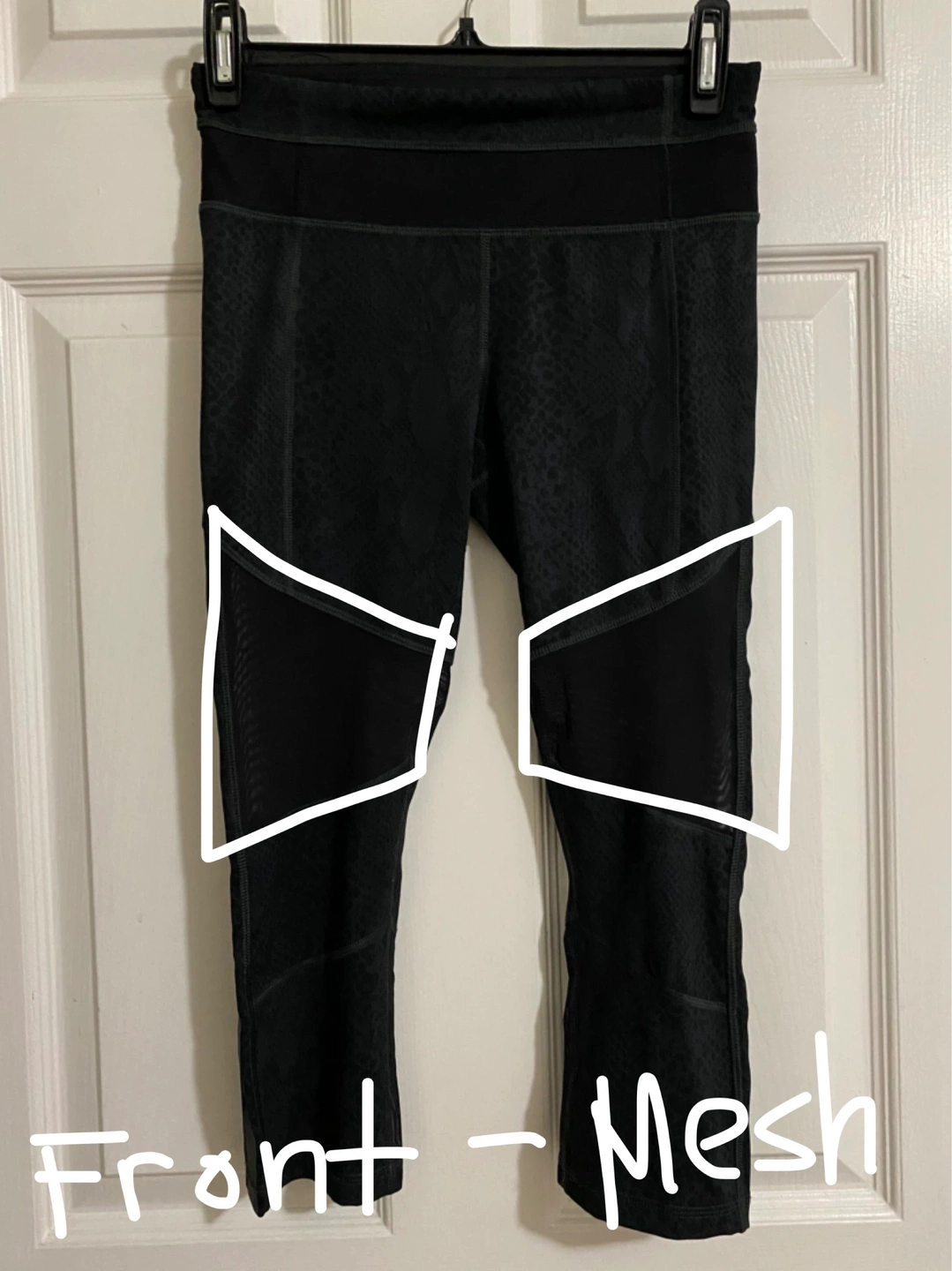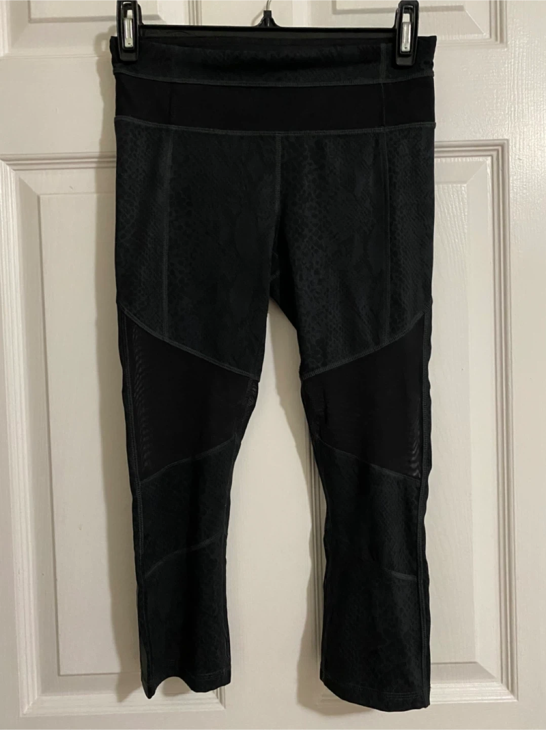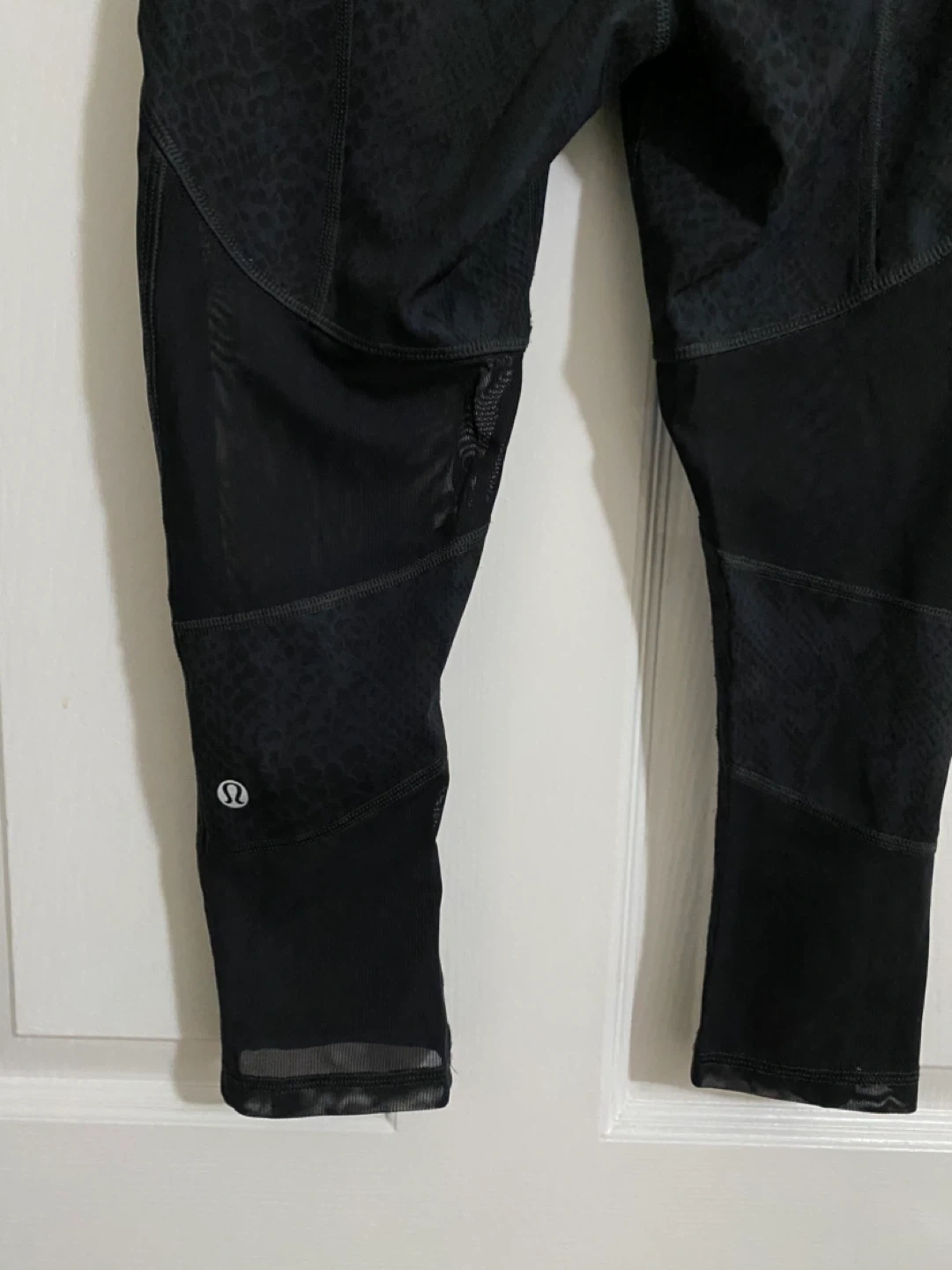 Selling a pair of Lululemon Athletica leggings in black, size 4. *black patterned mesh capris *used, good condition *see up close pics for pattern *mesh parts on legging (see pics) *zipper pocket on back of capris Priority to the fastest pickup. Pick up around McCowan and Alton Towers area. Cash only.