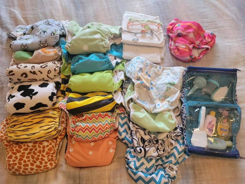 I am selling a variety of cloth diapers and accessories. Included are a selection of cloth diapers featuring fun animal prints, plus accessories for your little one. This would be a perfect bundle for anyone looking to try cloth diapering. I used these for both my kids right through potty training. All diapers have been stripped, and are in great used condition. each diaper has at least one liner, but can be customized for nap time or play time. these are a pocket style, with adjustable snaps to fit just right. There are also four covers that go over top to prevent pants from getting soiled. I'm including elastics if you want to try the classic fabric route of diapering. Baby kit was opened, but barely used, (happy to answer questions!). As well as two change pads. My hope is to give someone a blessing, as I was also blessed by this bundle. :)