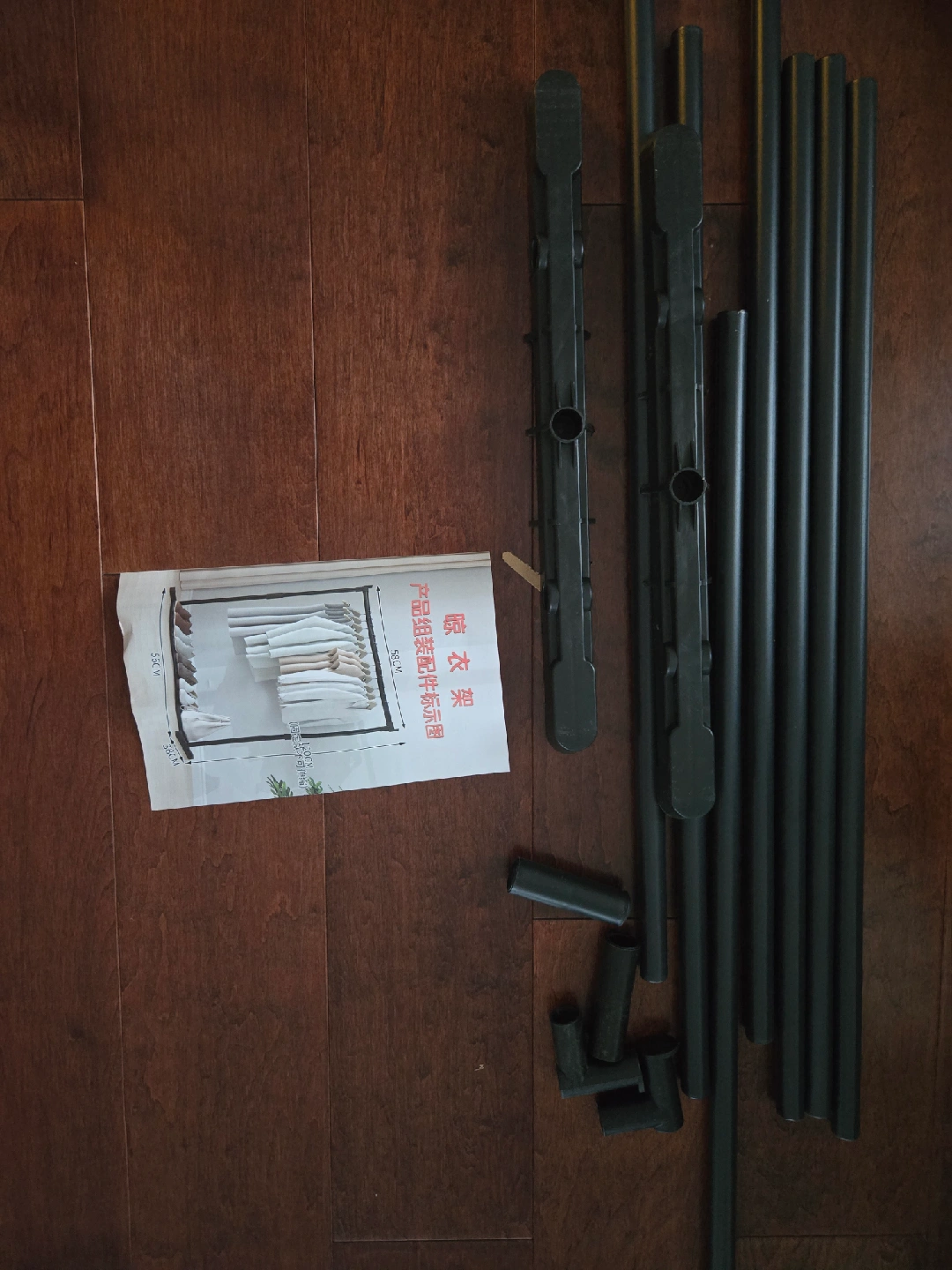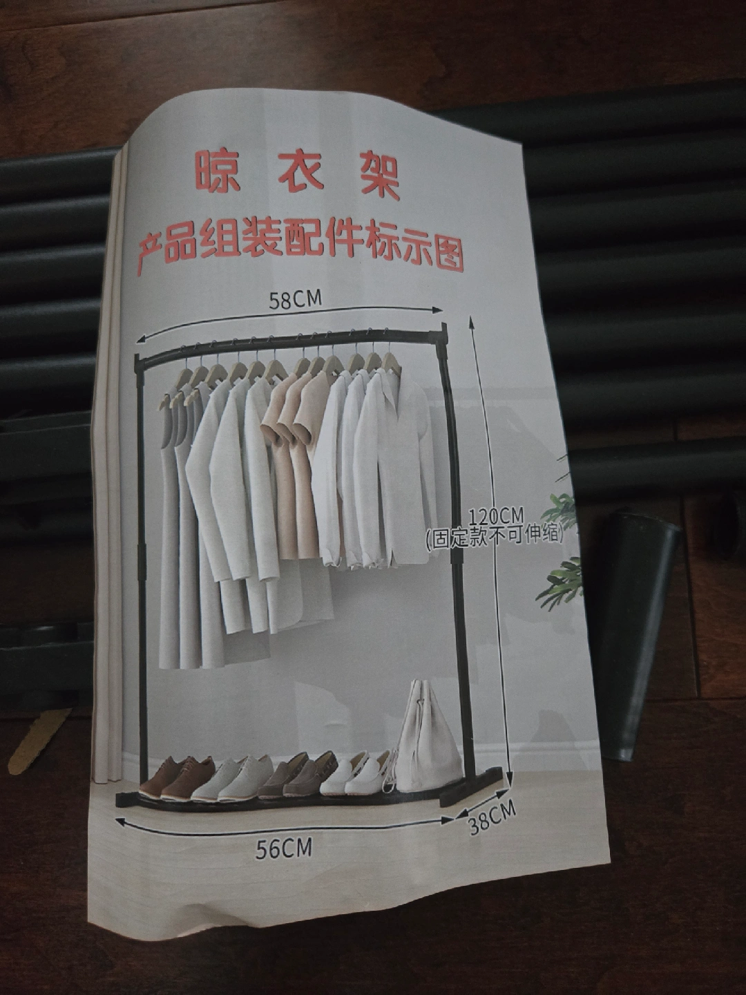 Clothes rack with dimensions 58cm wide, 120cm high, and 56cm long. It's 38cm deep. All the components are here!
