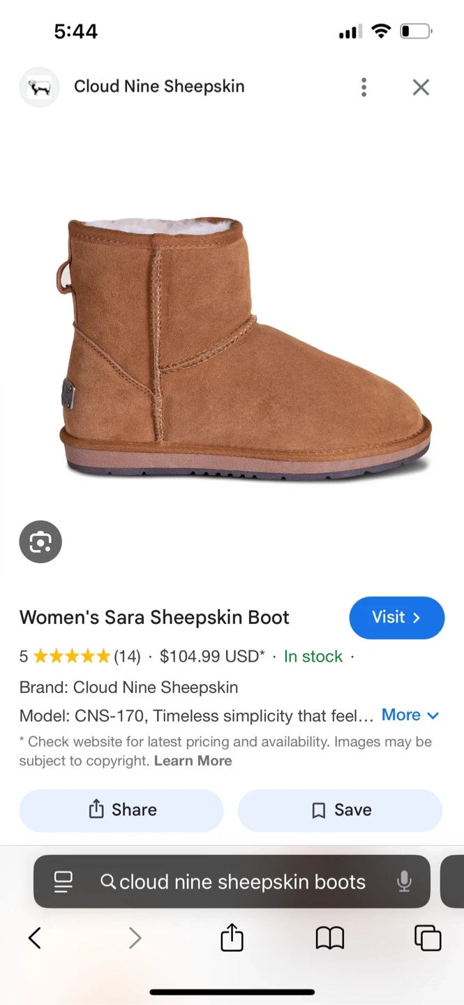 Cozy Cloud Nine Sara Sheepskin Boots in a women's size 8! These boots are perfect for keeping your feet warm and comfortable.The model number is CNS-170. A timeless style!
