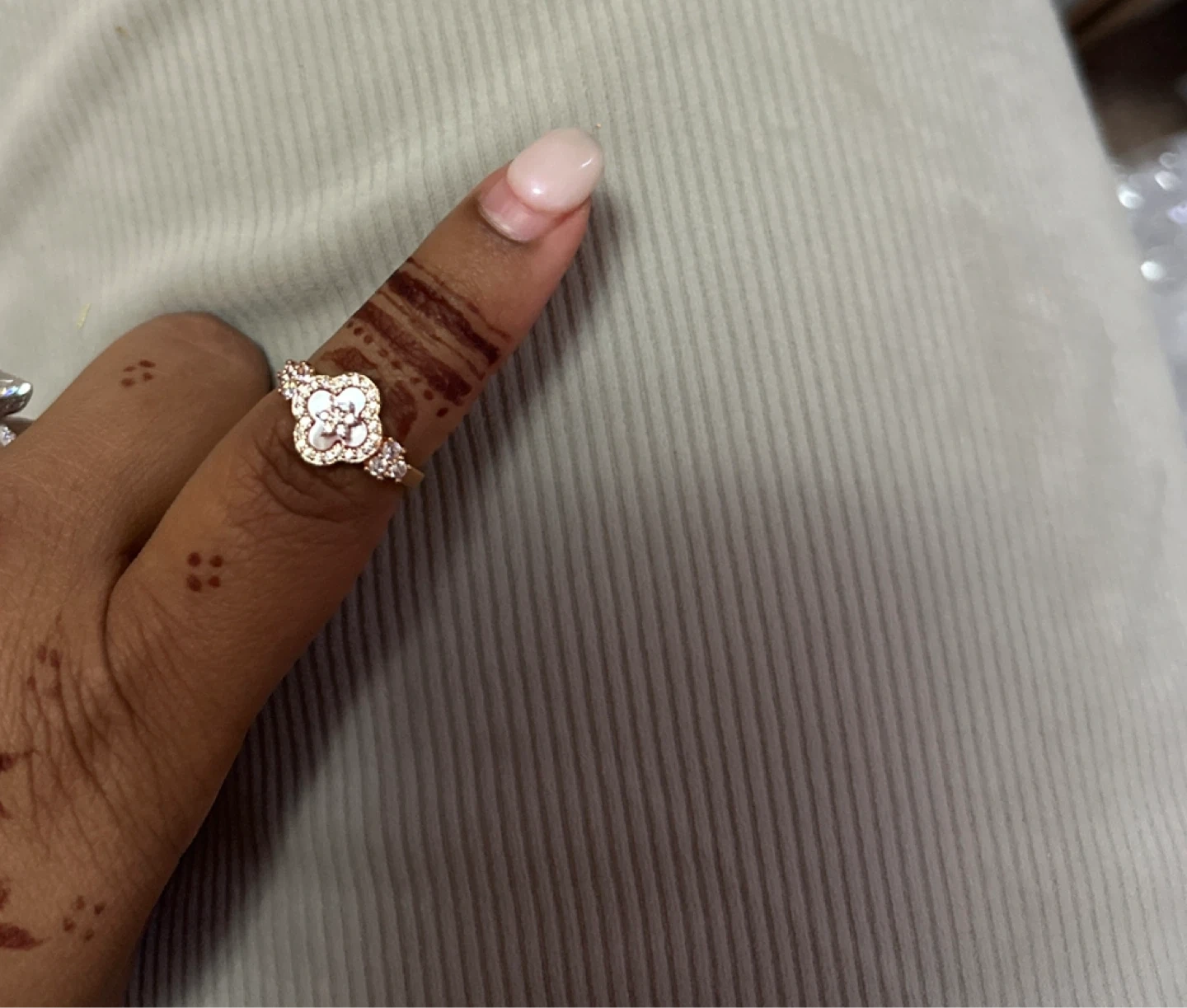 Beautiful clover ring with delicate design and small stones along the edges, in great condition—perfect for your jewelry collection.