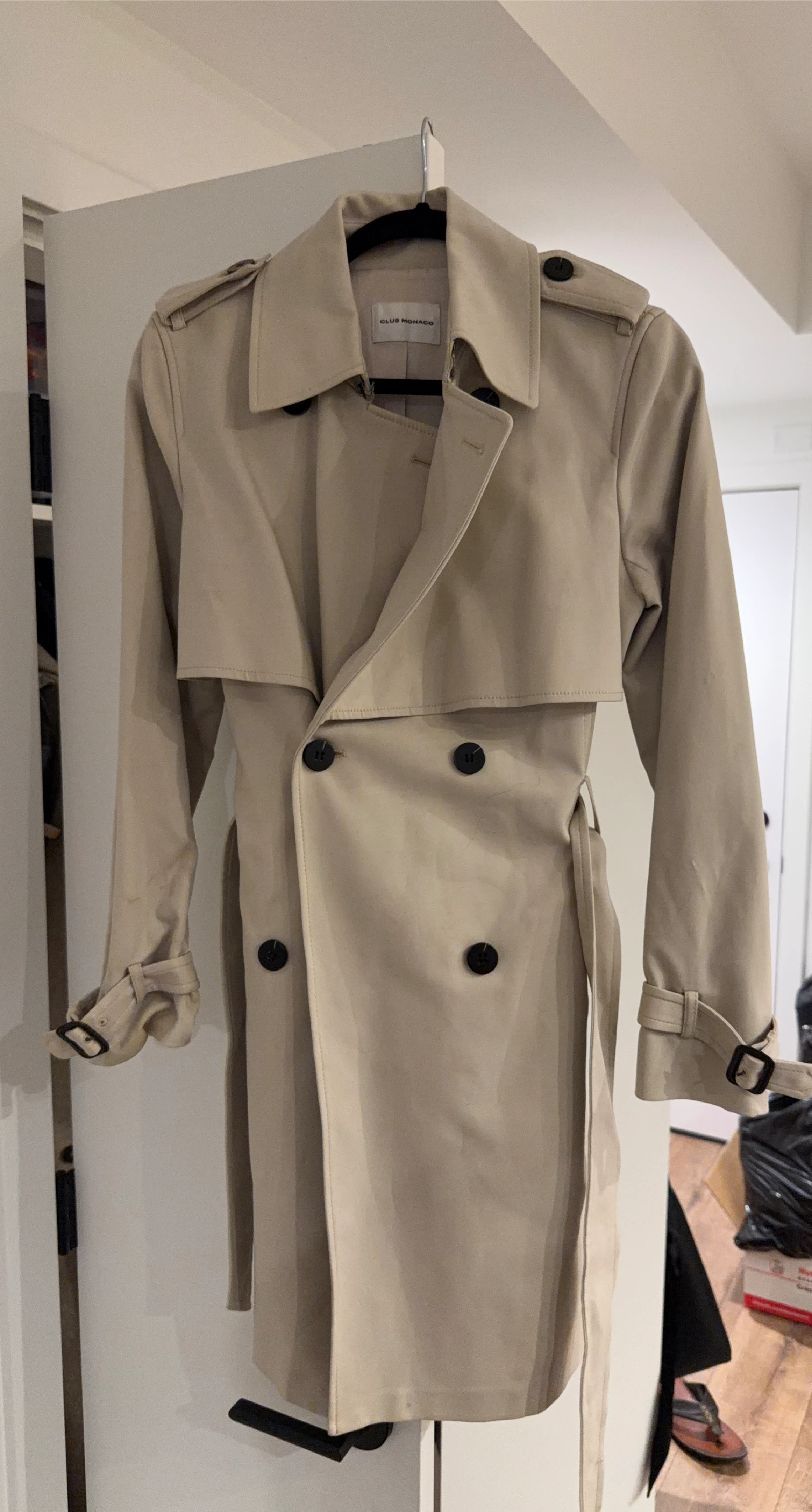 Classic Club Monaco trench coat in a lovely beige colour! Perfect for spring or fall. It's in great condition and ready for a new home