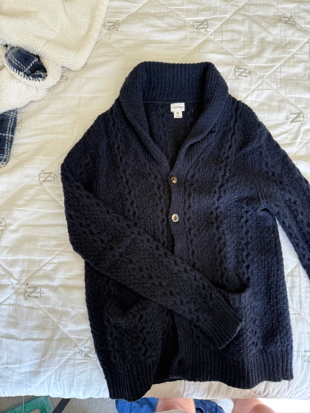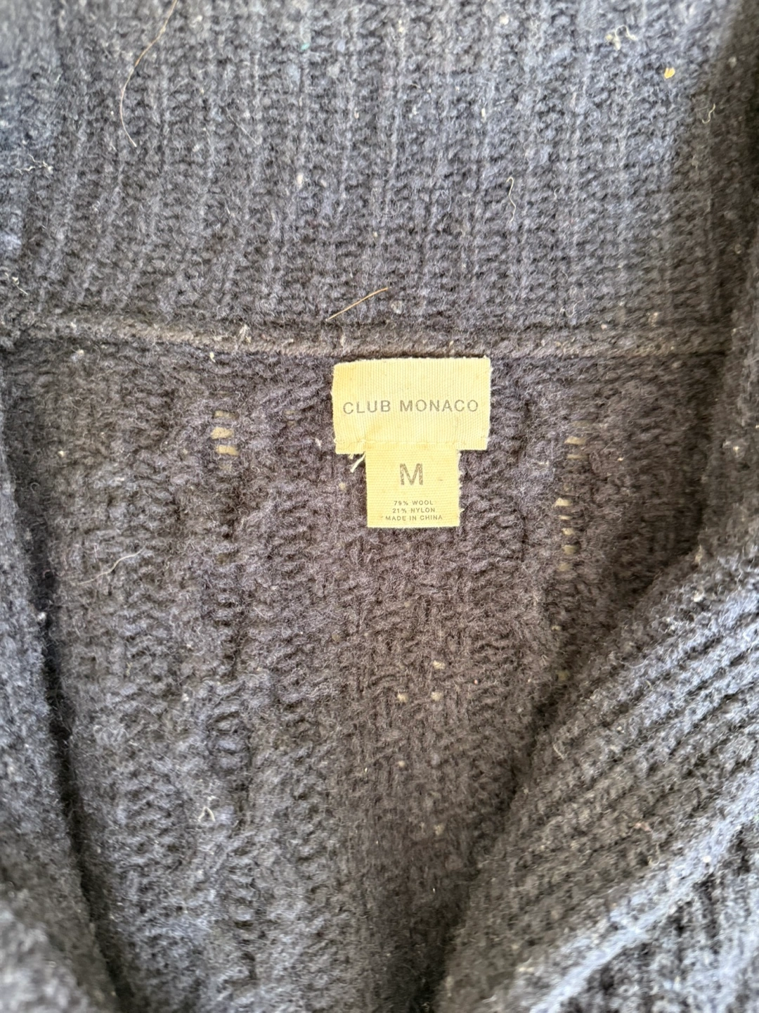 Cozy up with this Club Monaco cardigan! It's a size medium and made with a blend of 75% wool and 25% nylon. Perfect for layering on those chilly days!