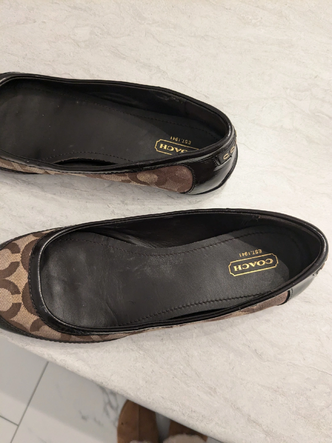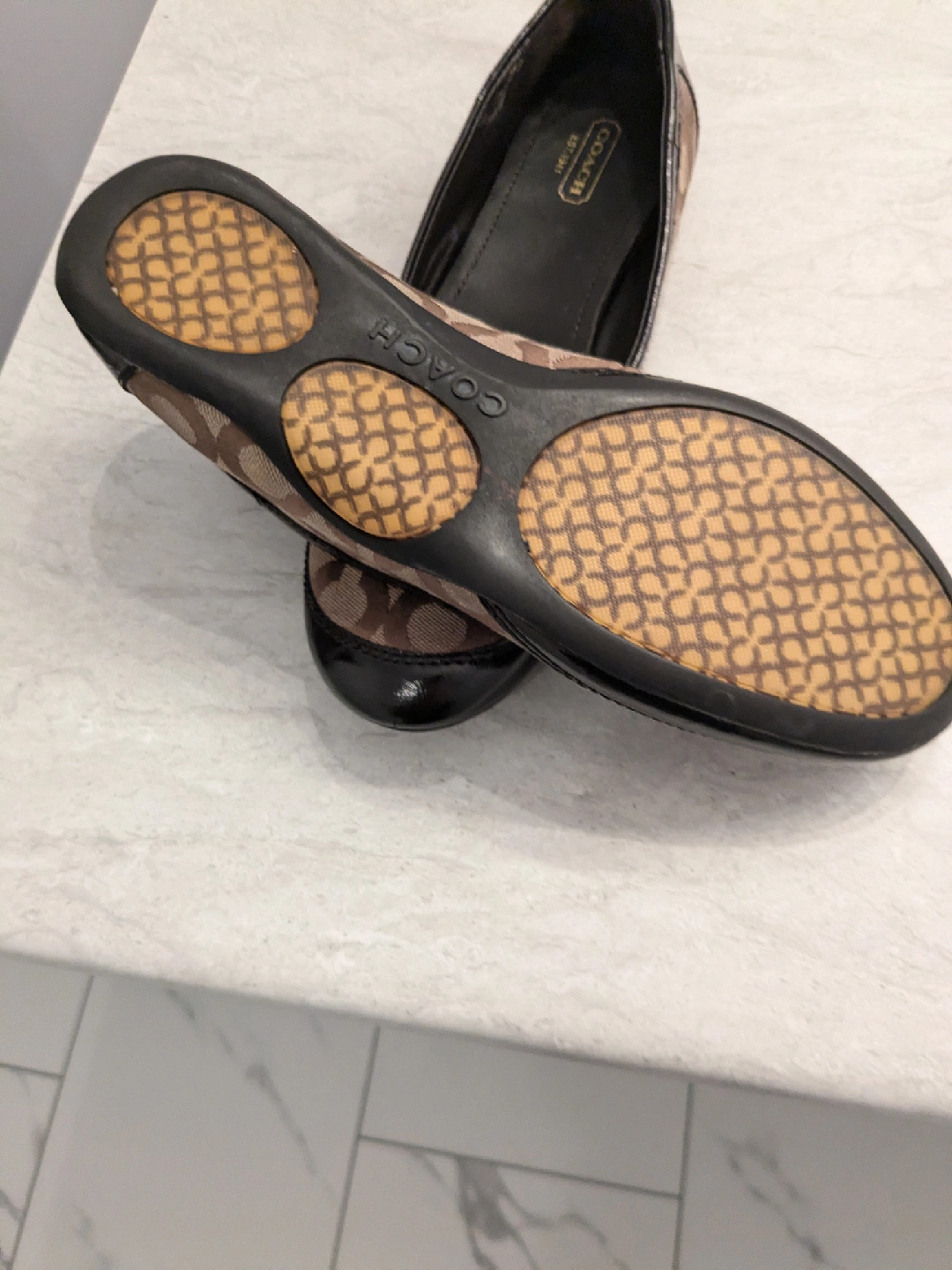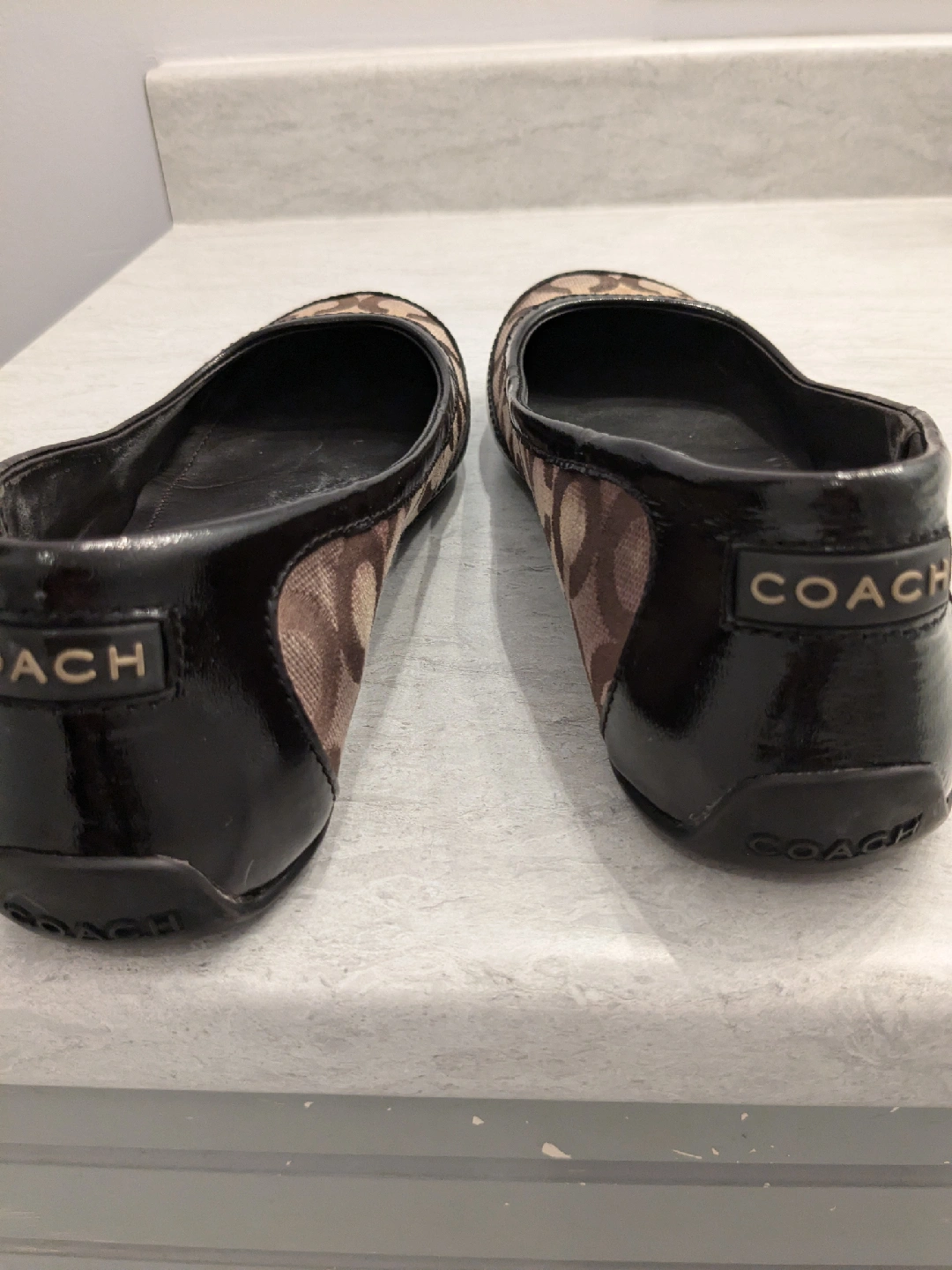 Selling a pair of Coach ballet flats! They feature a brown patterned design with a patent leather trim. They are in great condition . pickup only cash only please