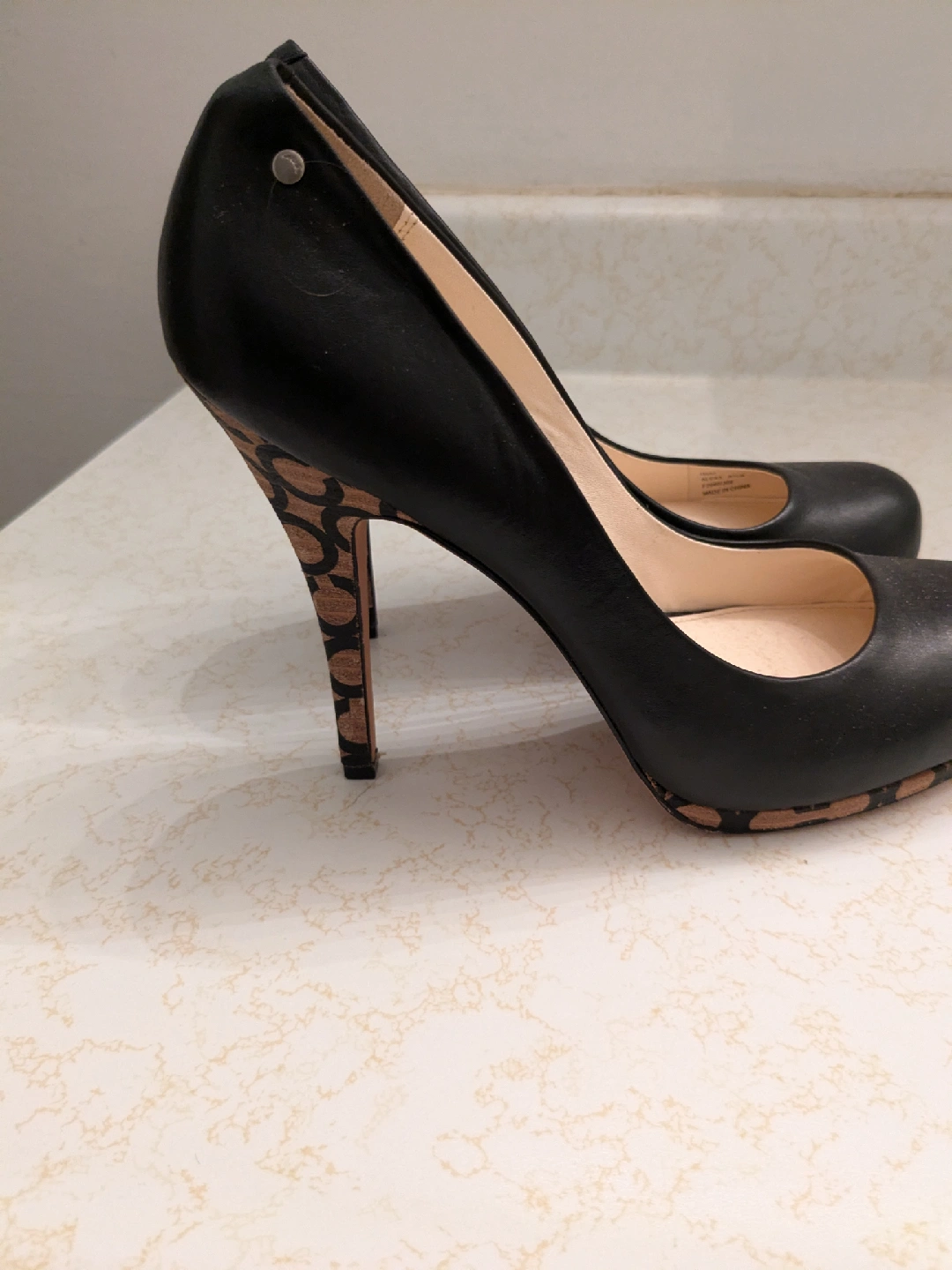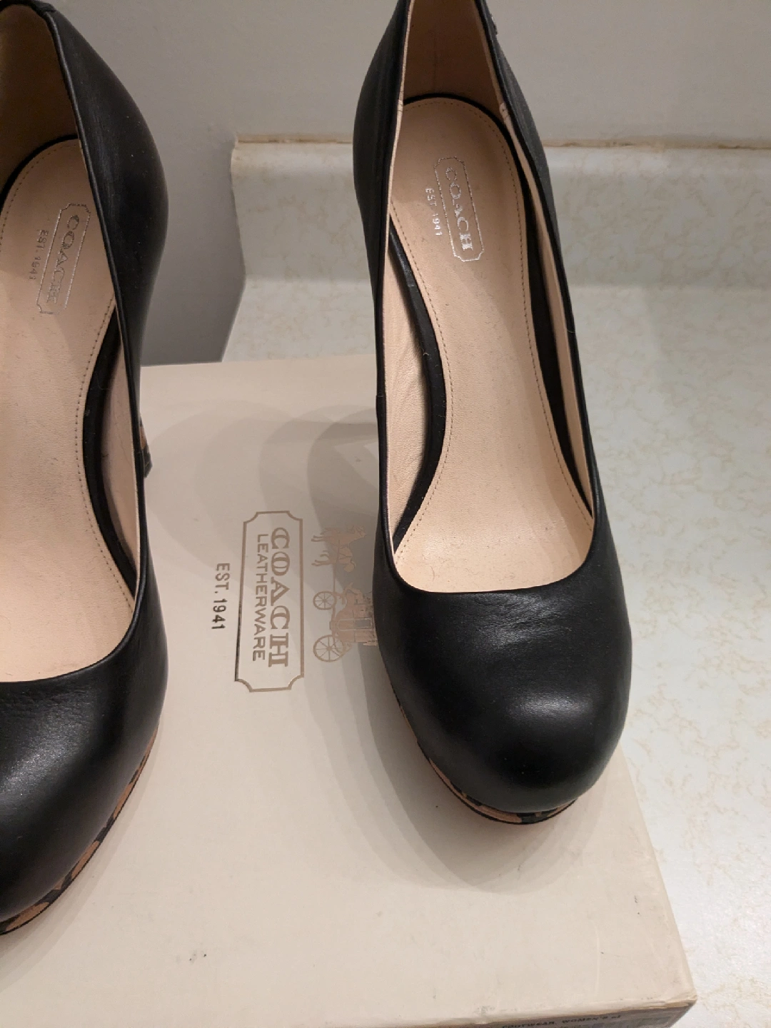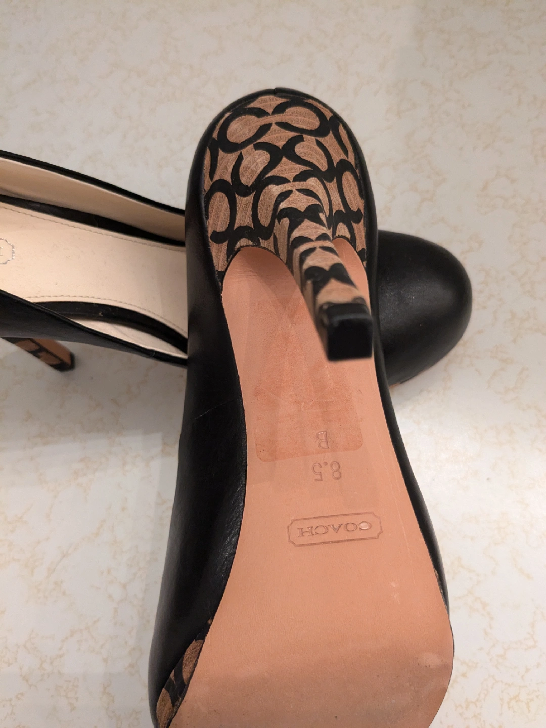 Selling a pair of Coach black leather heels in size 8 They feature a unique design on the heel and come with the original box. Heels 4.5 inches Perfect for adding a touch of elegance to any outfit! Brand New in Box with authentic card