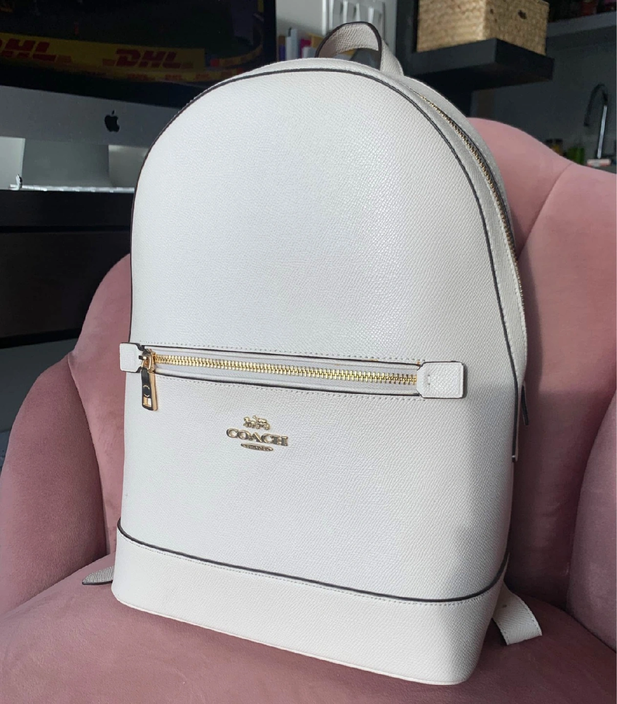 Gently used once. Pristine condition. Color: White + gold hardware Crossgrain leather Inside zip, cell phone and multifunction pockets, water bottle/umbrella pockets Zip closure, fabric lining Top handle with 3 1/4" drop Outside zip pocket Adjustable shoulder straps 10" (L) x 14" (H) x 5 1/2" (W) Delivery available for a small fee Reason for selling: Don't fit my laptop's (16" inc), but a 14" inch can fit, special a MacBook.