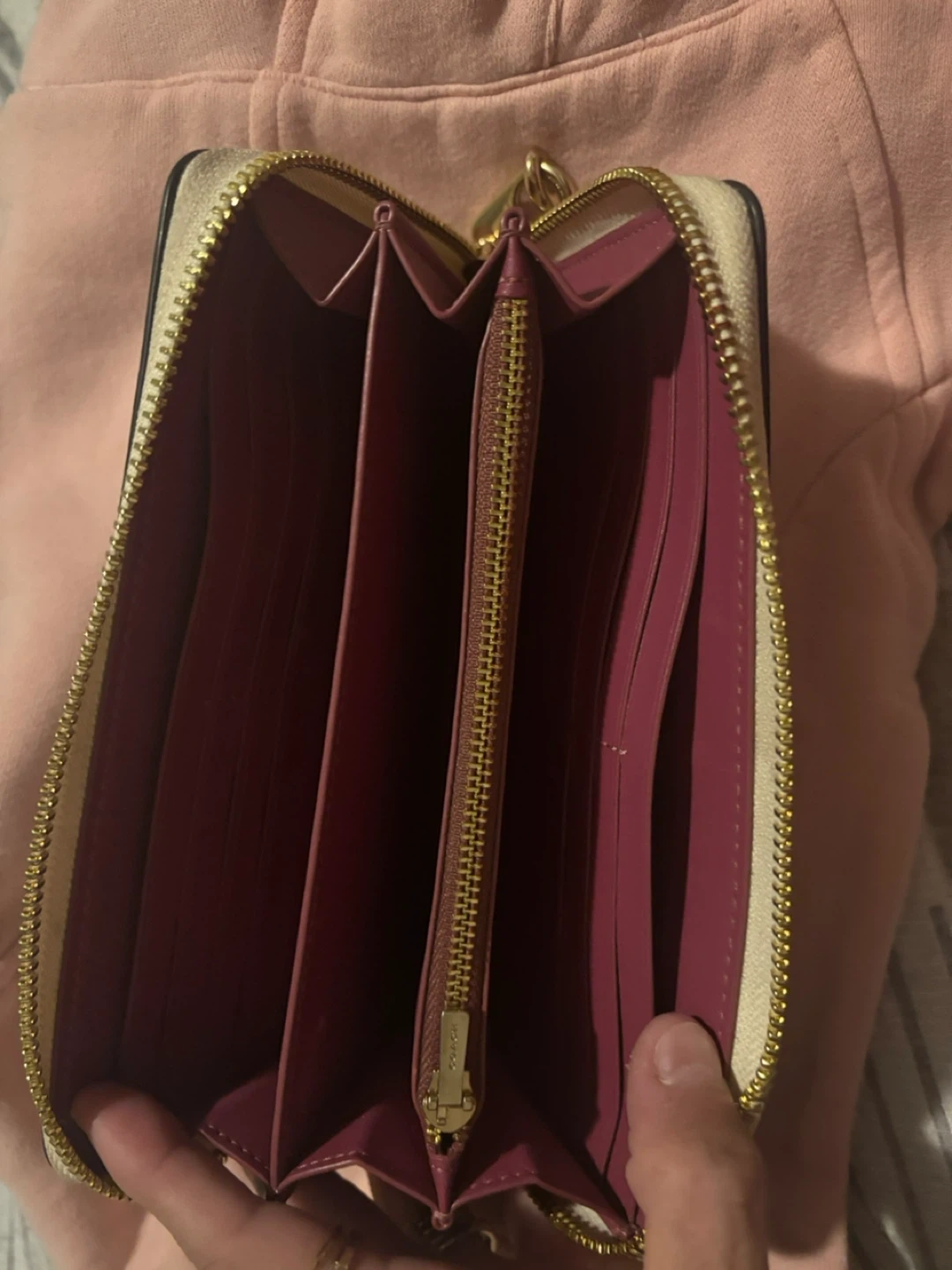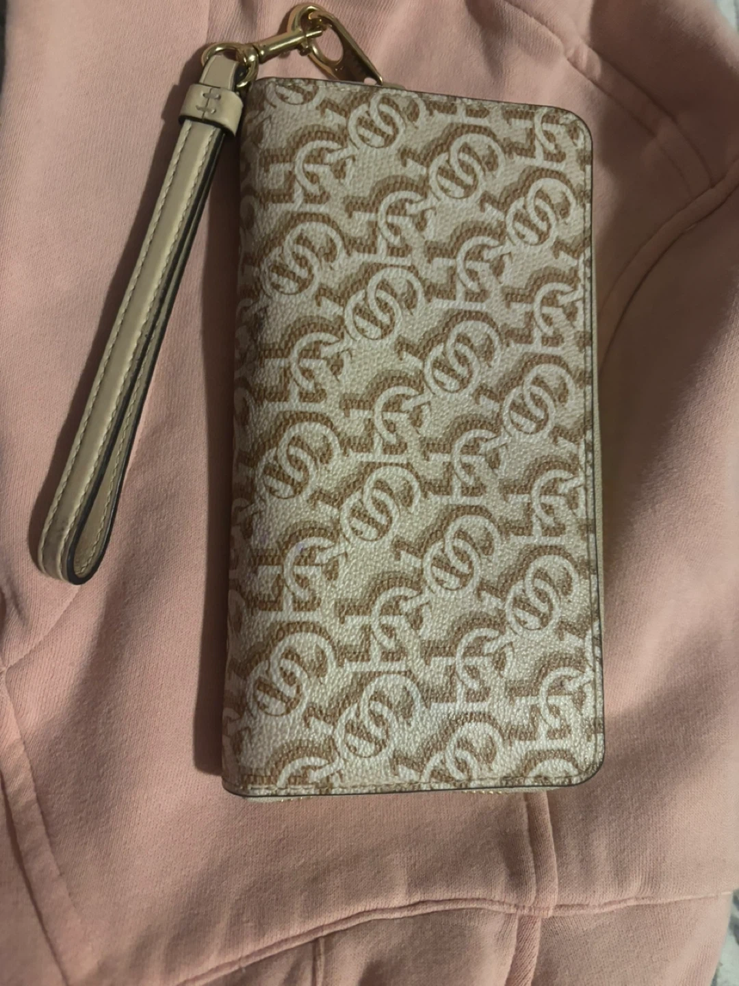 Selling a Coach wallet in beige and pink! It has a wrist strap and a gold zipper. Inside, there are several compartments for cards and cash. It's in great condition!