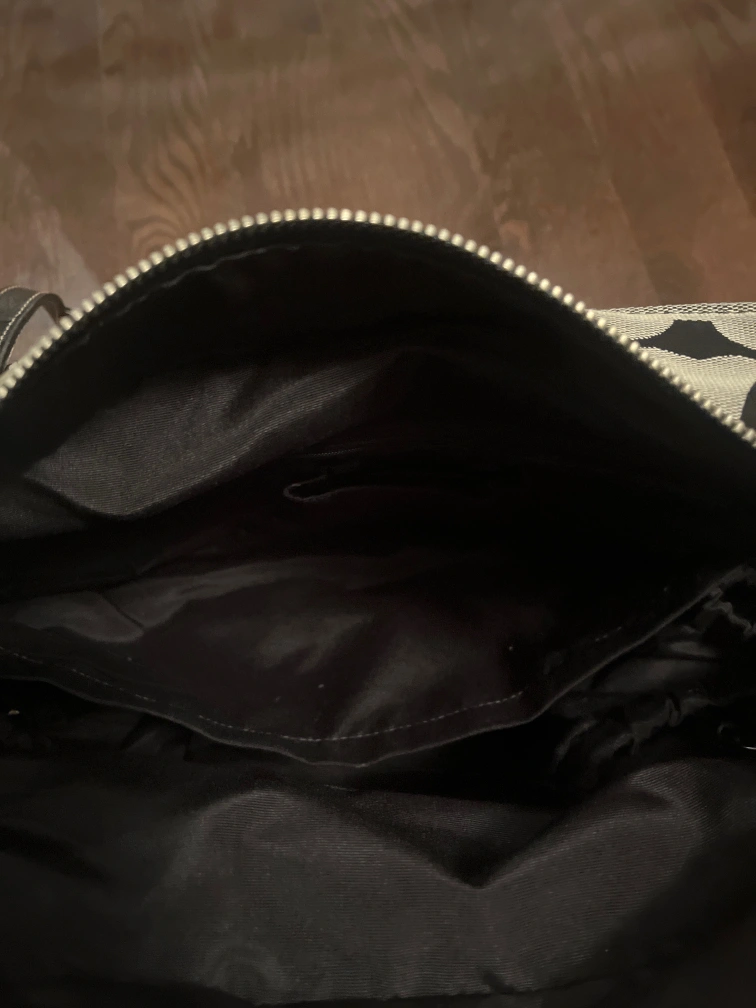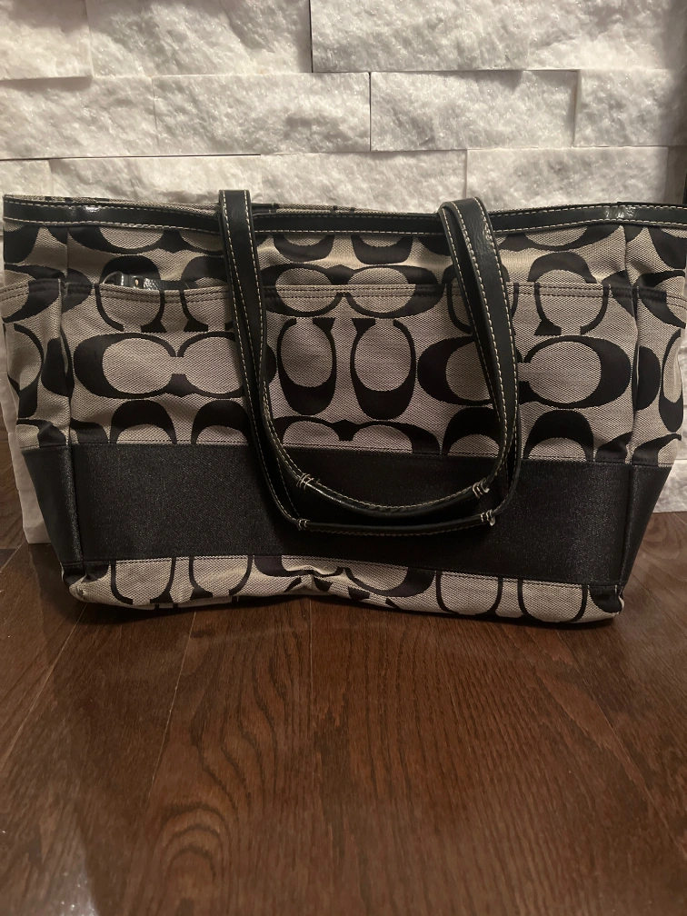 Selling a Coach tote bag in a black and beige pattern. It comes with an additional strap. It's in great condition and ready for a new home!