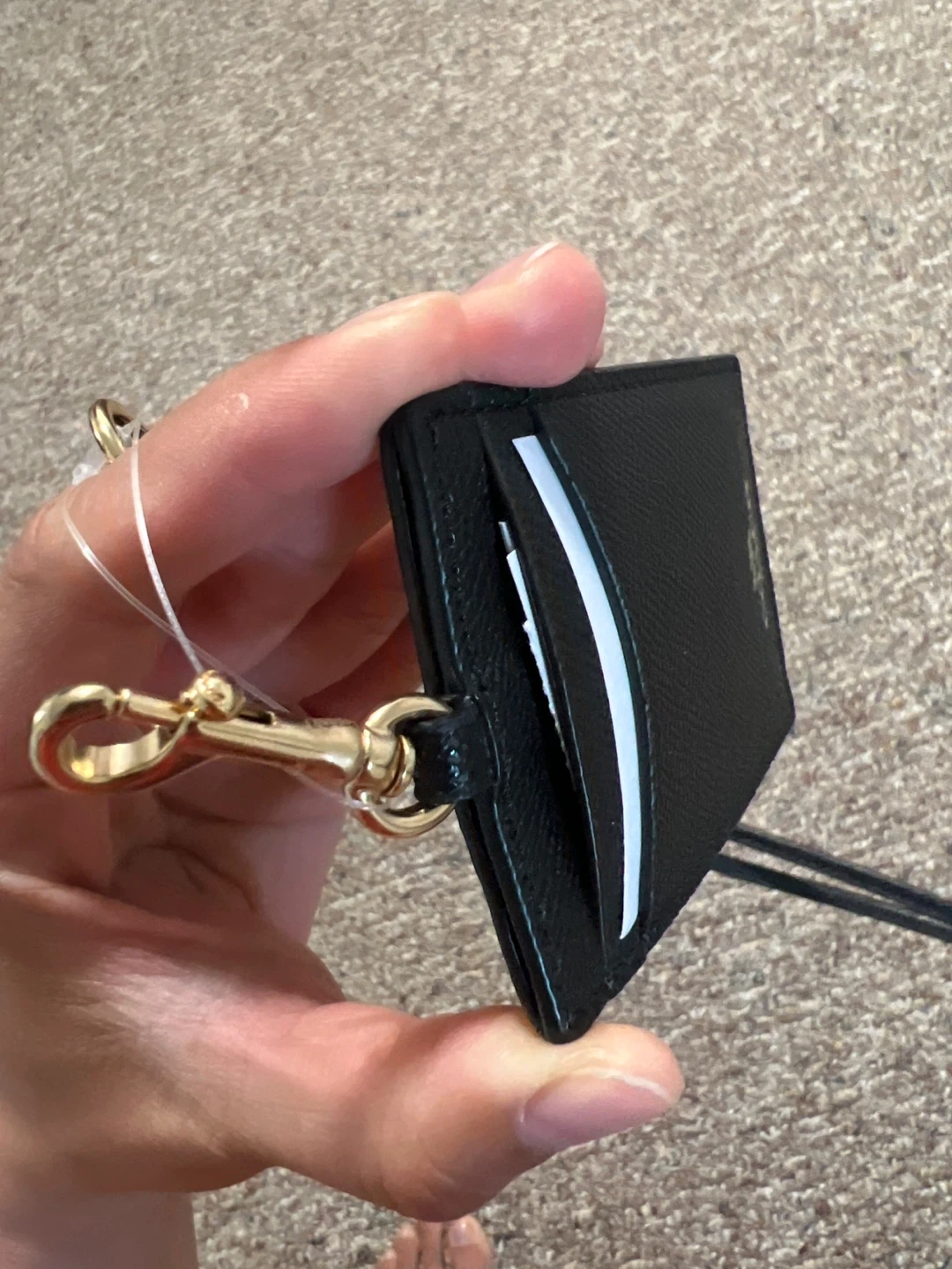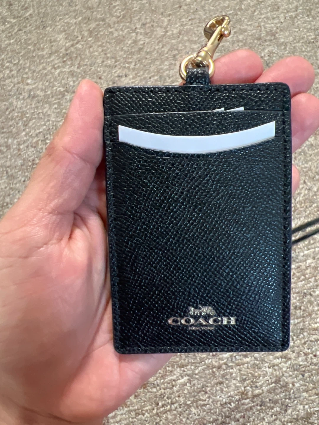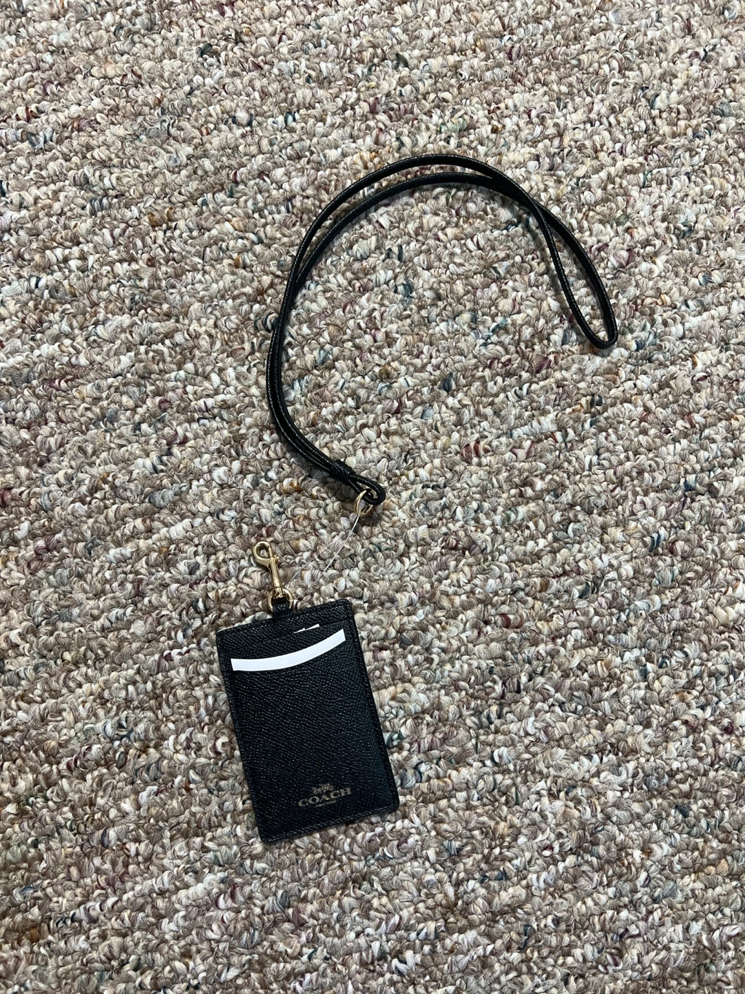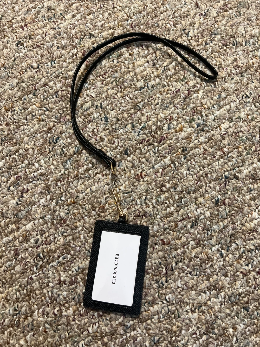 Selling a Coach lanyard card holder in black. It's in great condition and perfect for keeping your cards organized and easily accessible. The lanyard is also included!