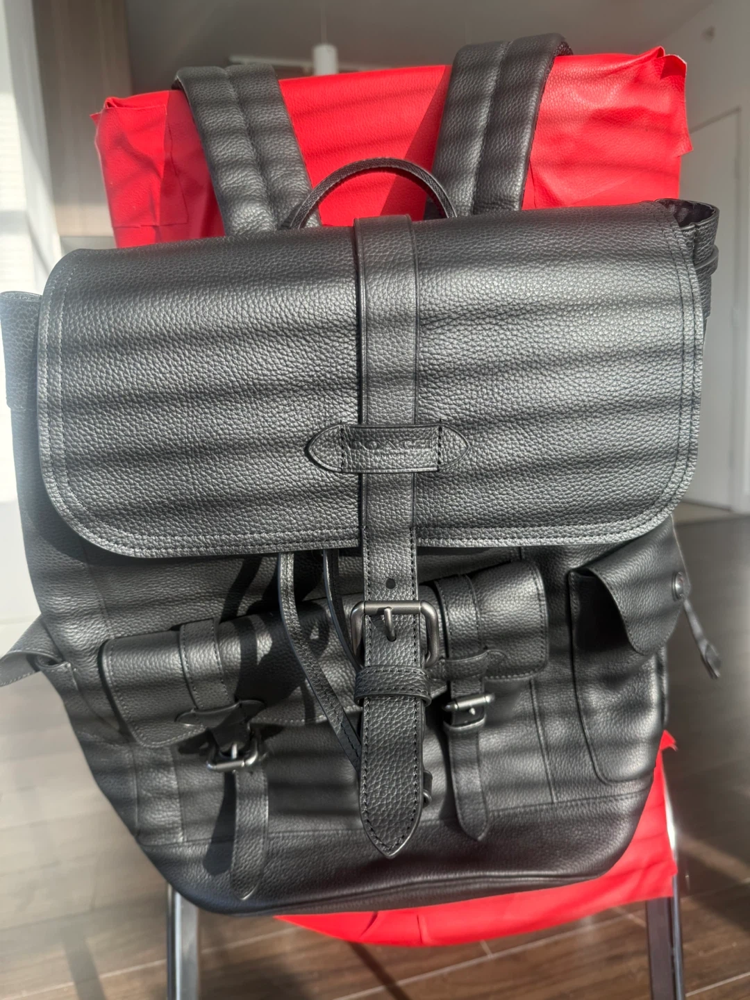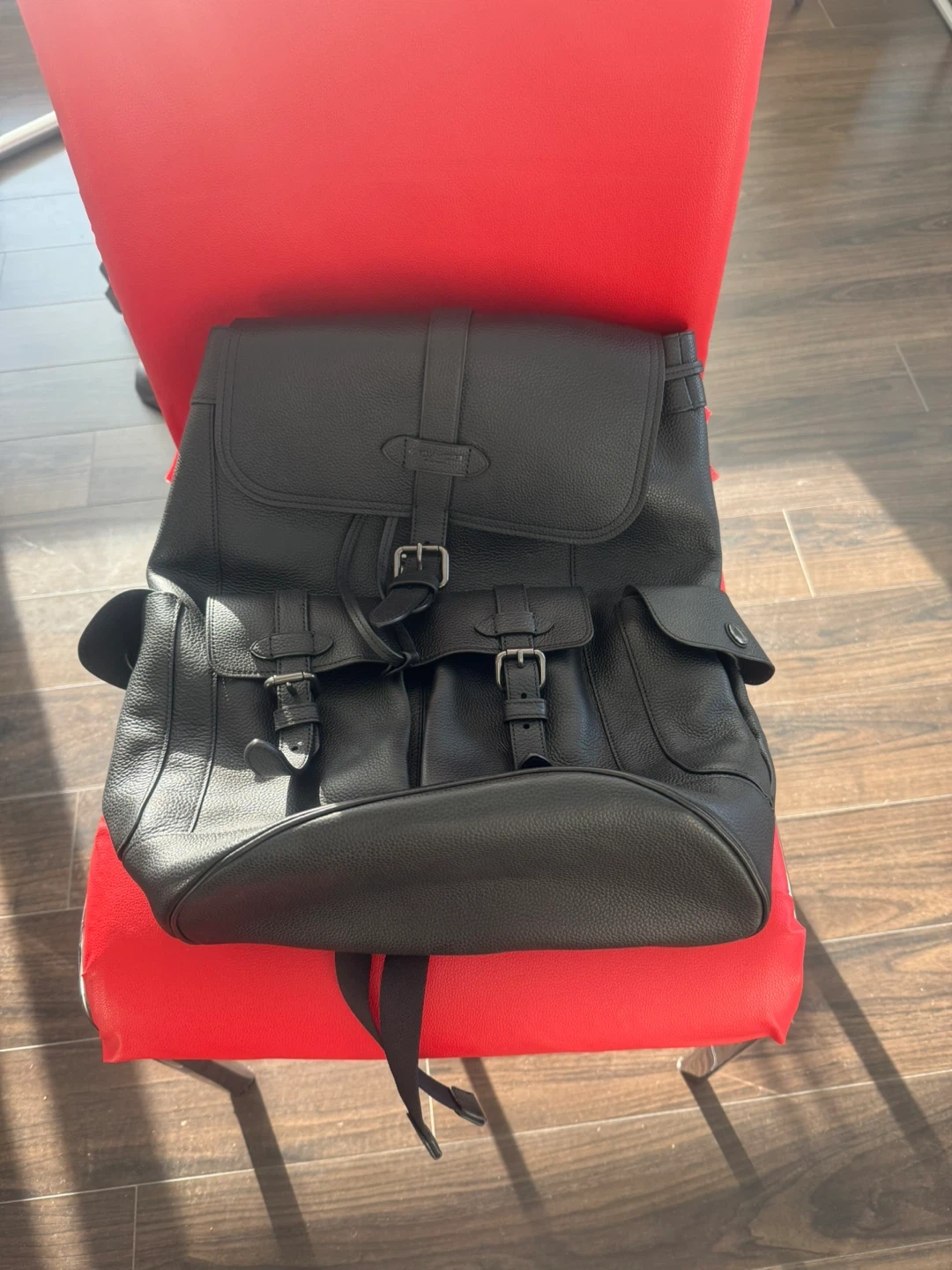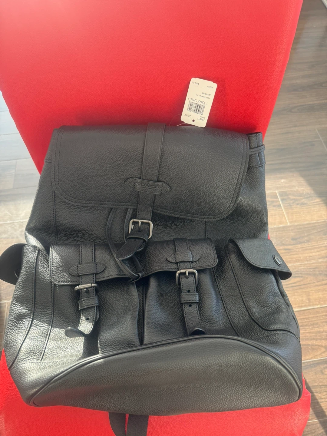 This is a stylish Coach backpack in black leather. It's new. Perfect for everyday use or travel! The tag is still attached.