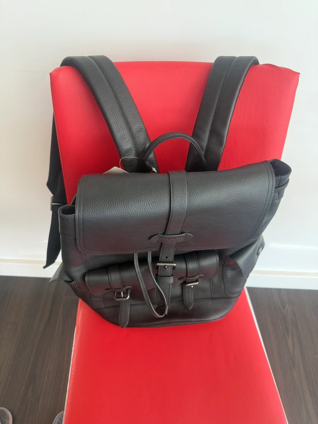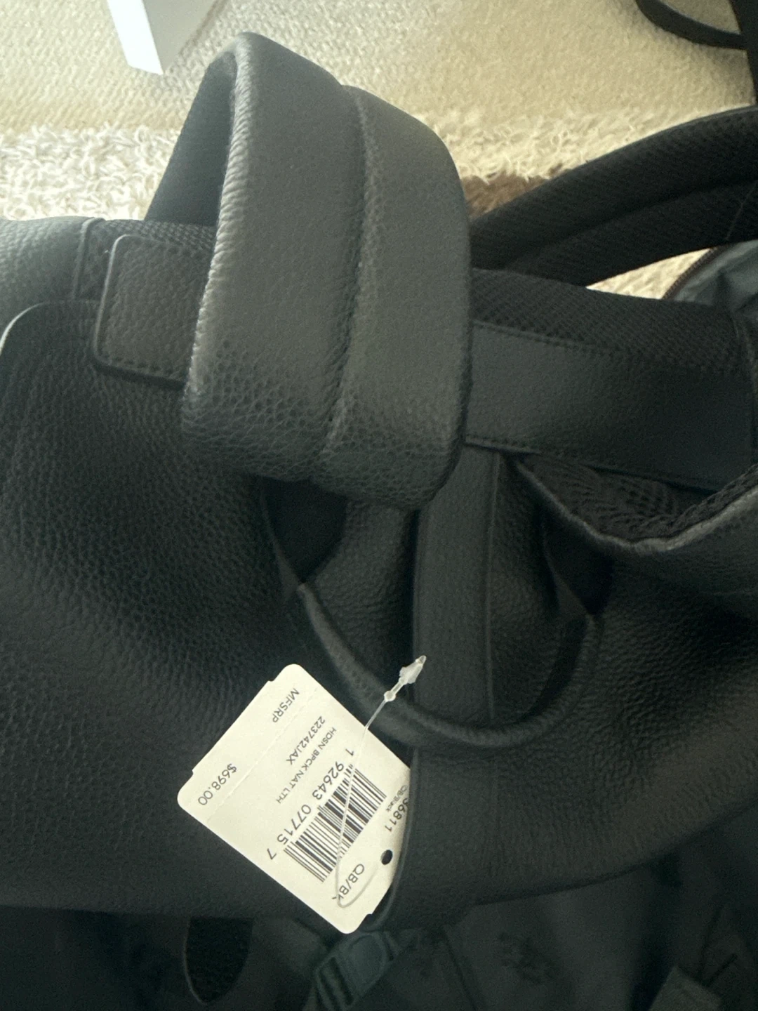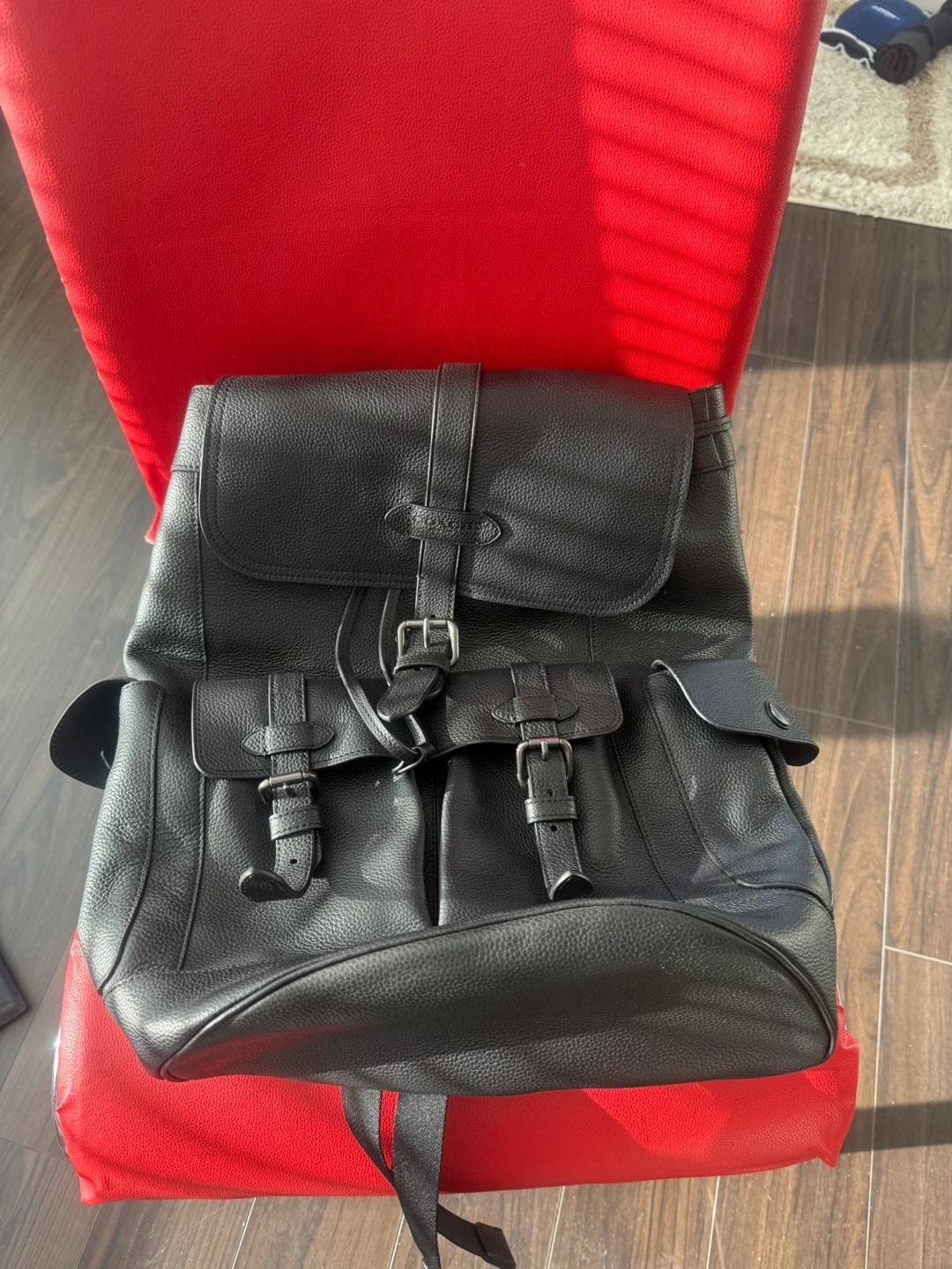 This is a stylish Coach backpack in black leather. It's new. Perfect for everyday use or travel! The tag is still attached.