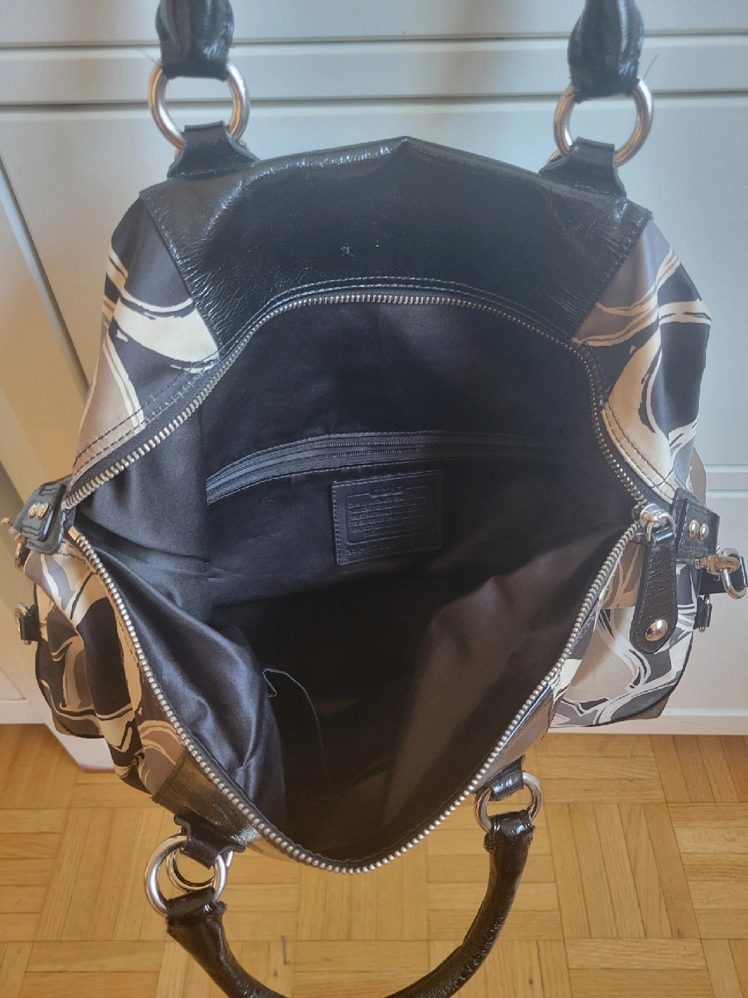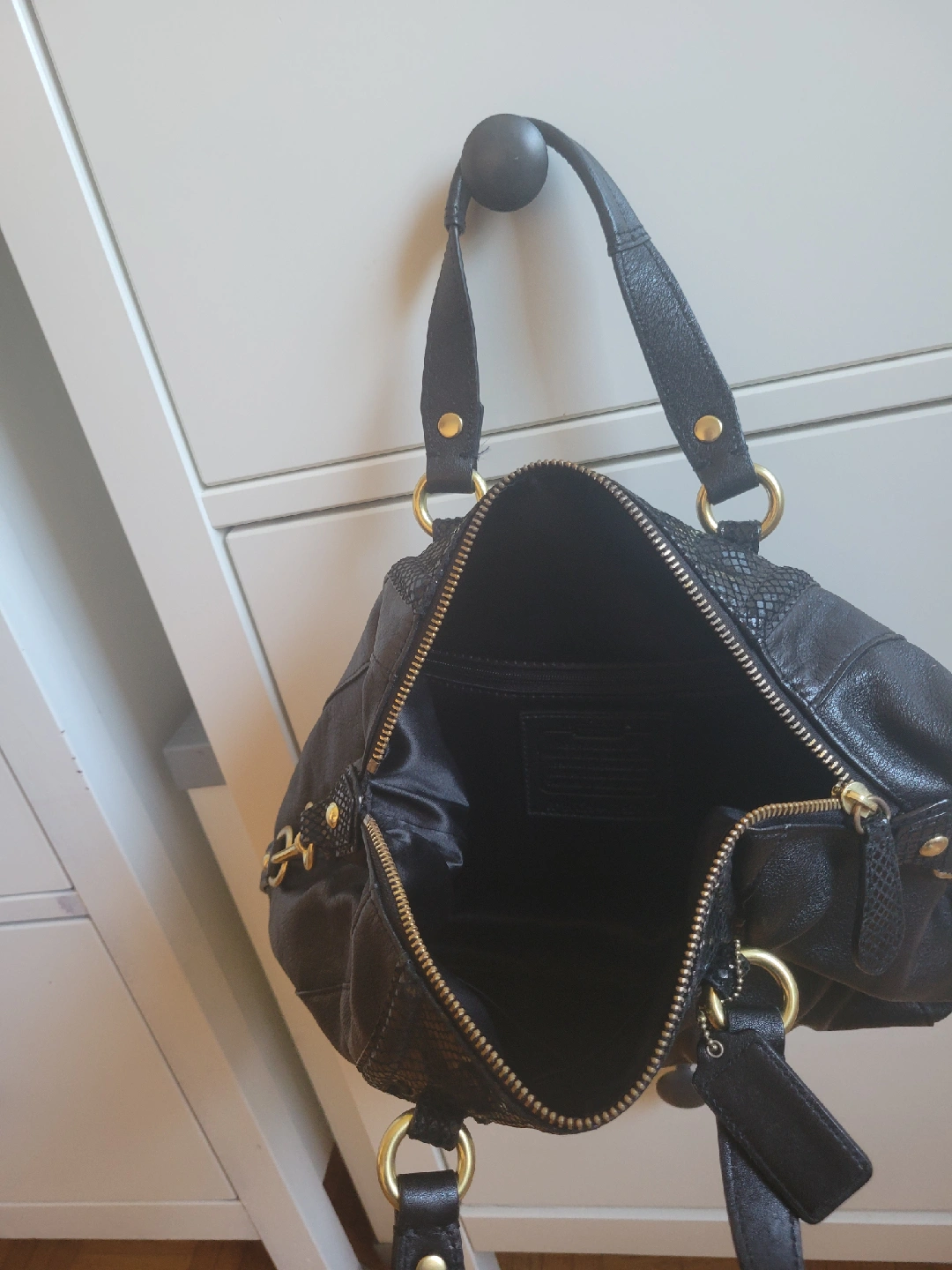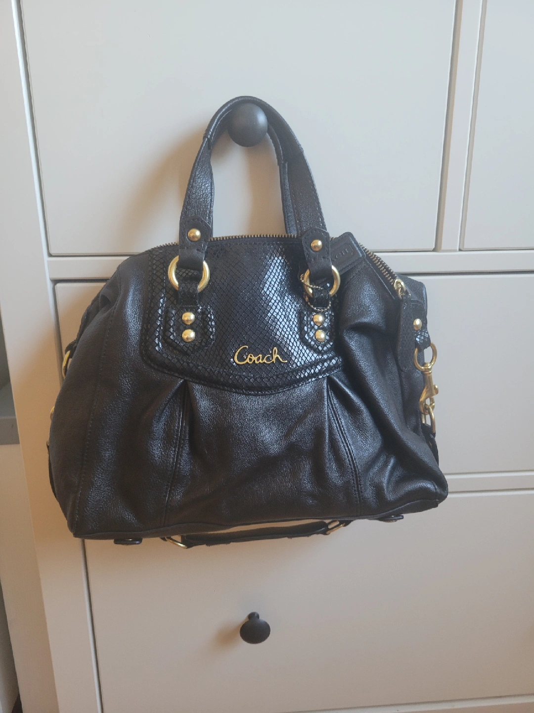 Selling a stylish black leather Coach handbag. It's in great condition and features gold hardware. comes with shoulder straps, no rips or stain barely used.