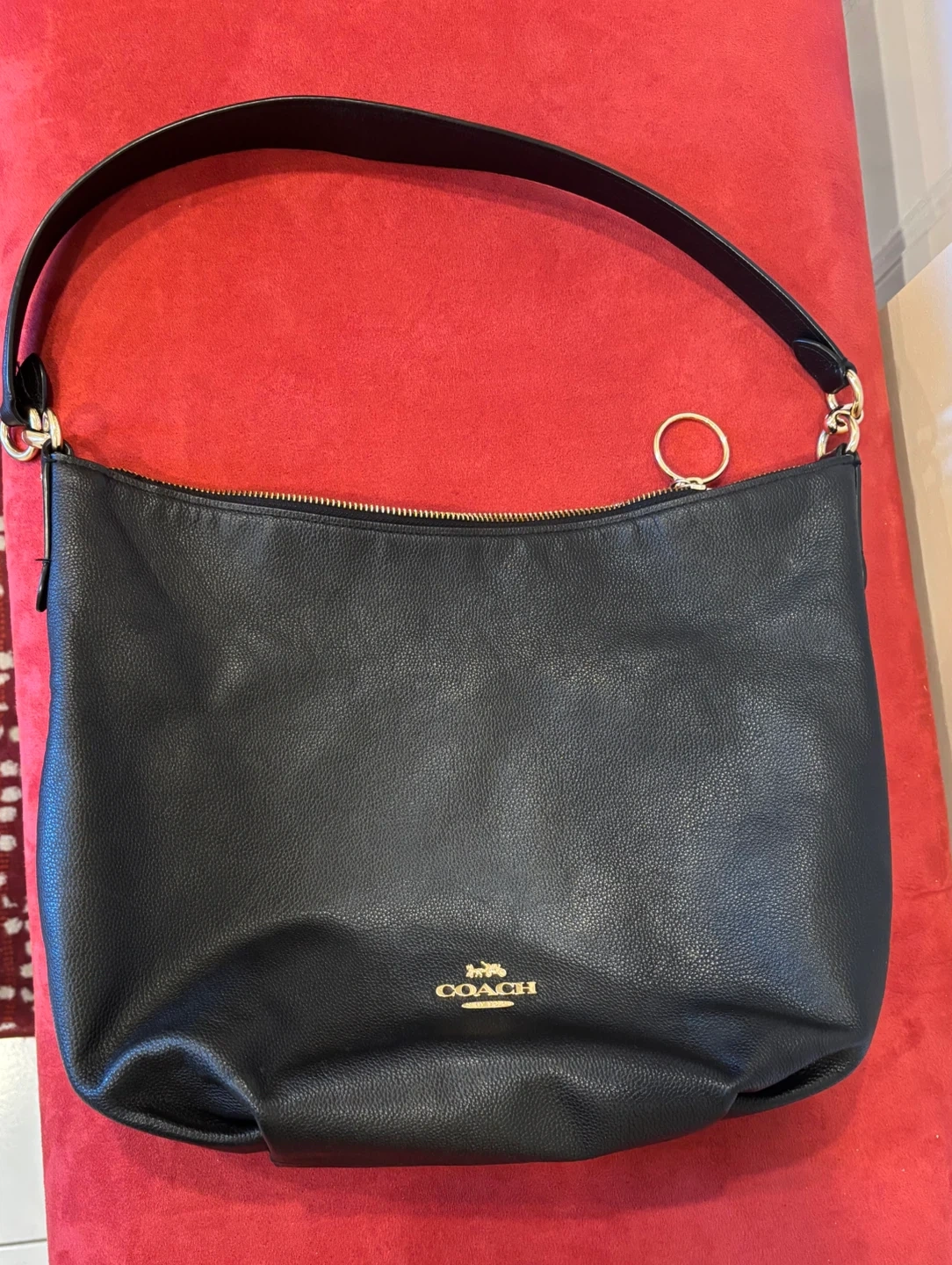 Selling a gently used Coach shoulder bag in black leather. It’s in great condition and perfect for everyday use! The bag features a zipper closure.