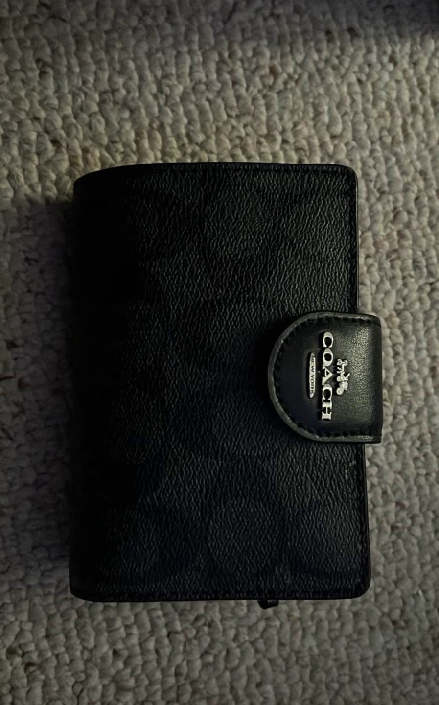 Selling a Coach black leather wallet. It's in great condition and has the classic Coach logo on the snap closure. Perfect for keeping your cards and cash organized!