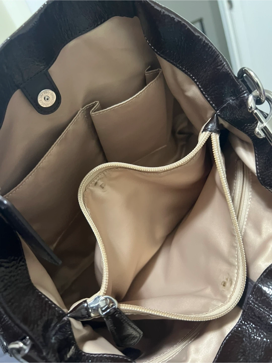 Selling a Coach tote bag in black patent leather. This stylish bag is perfect for everyday use. It features a spacious interior with multiple pockets to keep your belongings organized. The bag is in good condition very clean inside and out