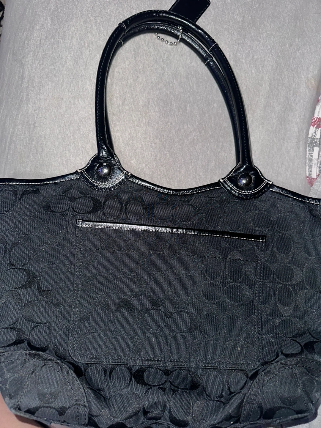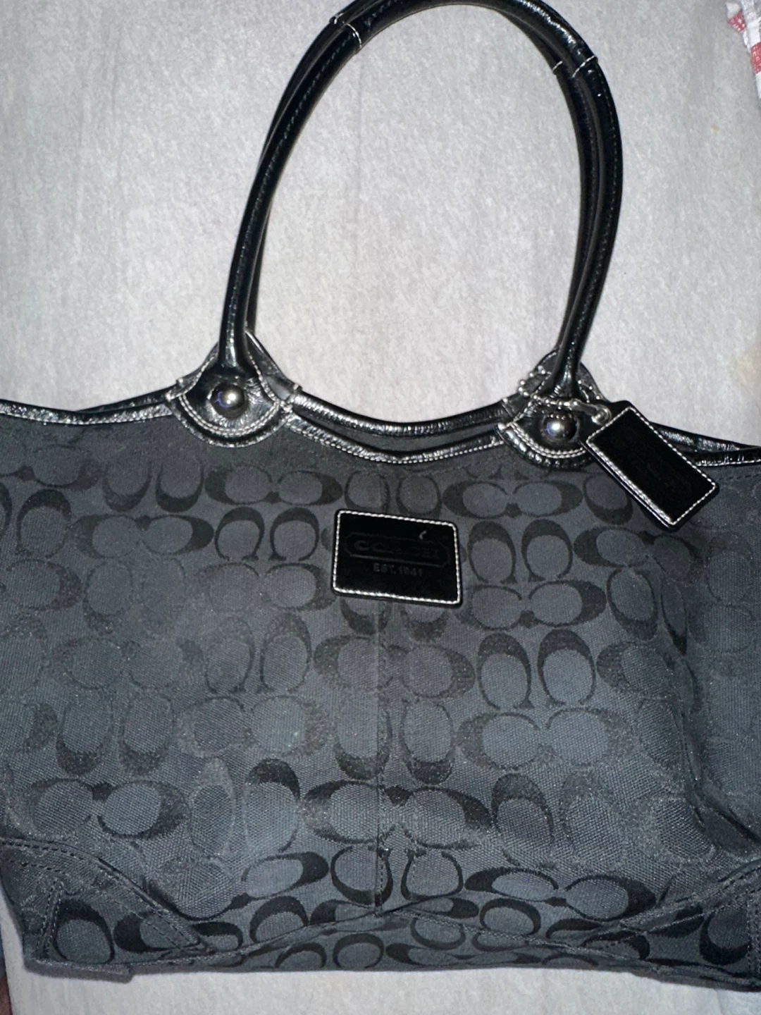 This is a Coach tote bag in black with the signature Coach pattern. It's a stylish and functional bag, perfect for everyday use. The bag is in good condition and ready for a new home! Selling 30 or best offer Can meet up at Millwoods Town Centre