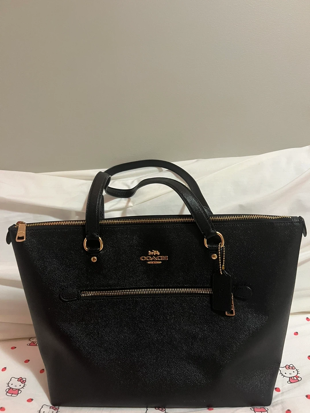 Selling a black Coach tote bag. It's in great condition and perfect for everyday use! The bag features gold-tone hardware and a convenient zip closure. It's a stylish and practical accessory
