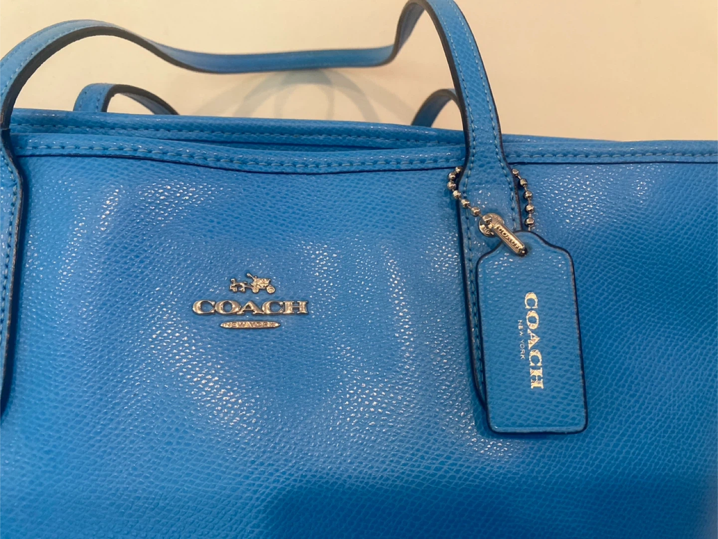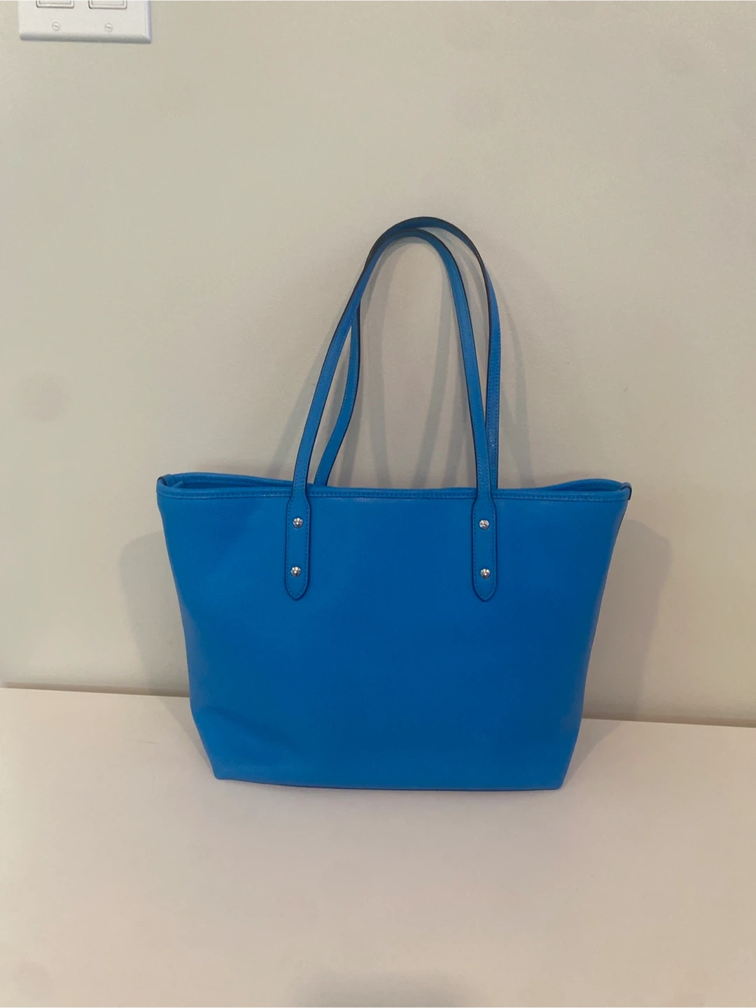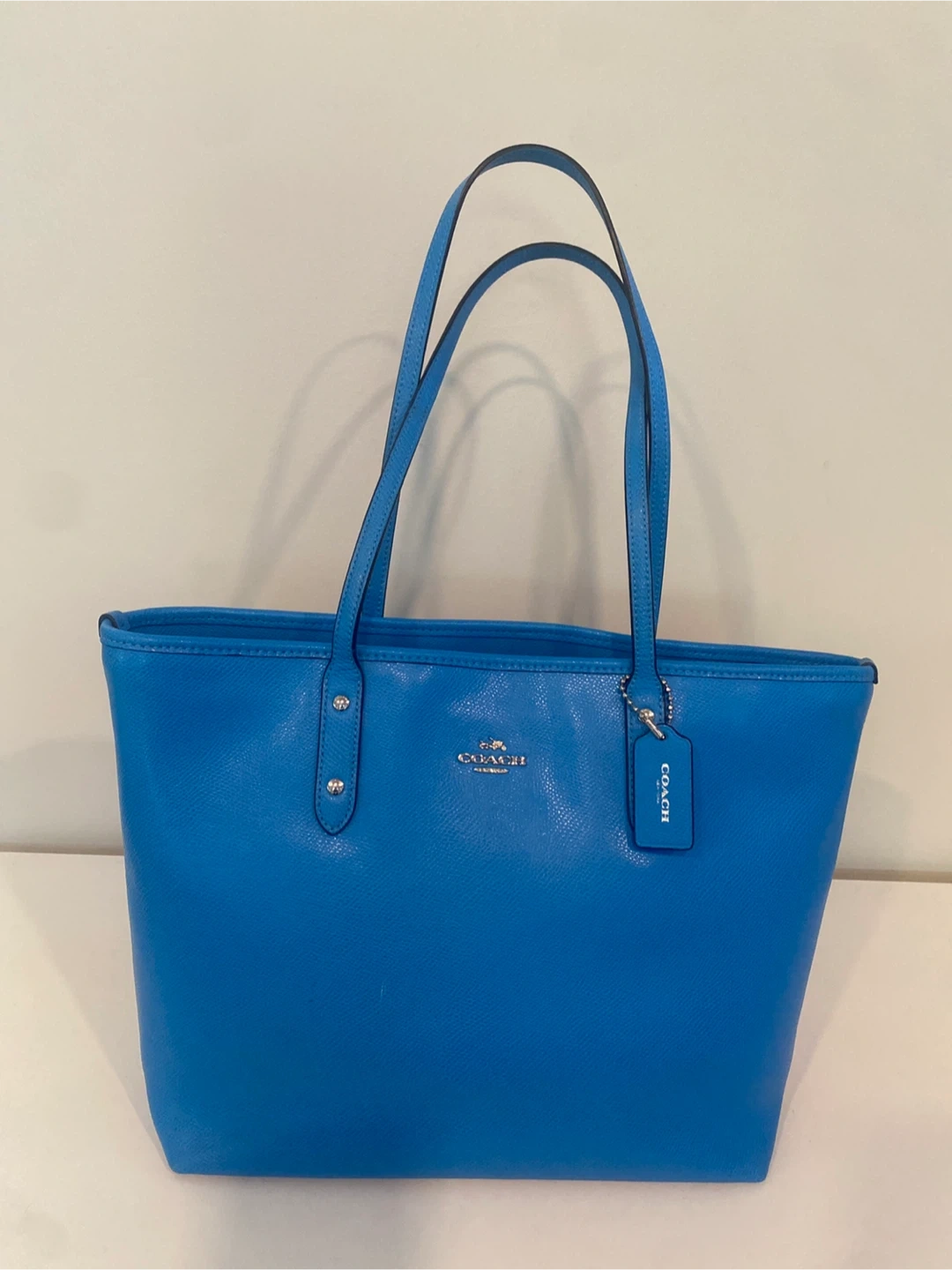 This is a Coach tote bag in a vibrant blue colour! It's made of leather and is in great condition. Perfect for carrying your everyday essentials! 30 cm X 27 cm X 14 cm Pick up in Rocky Ridge