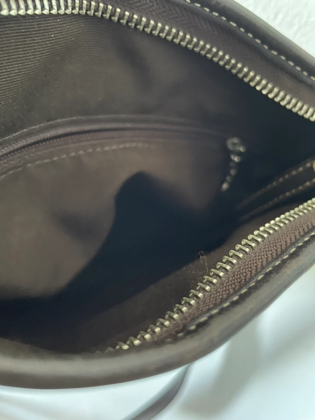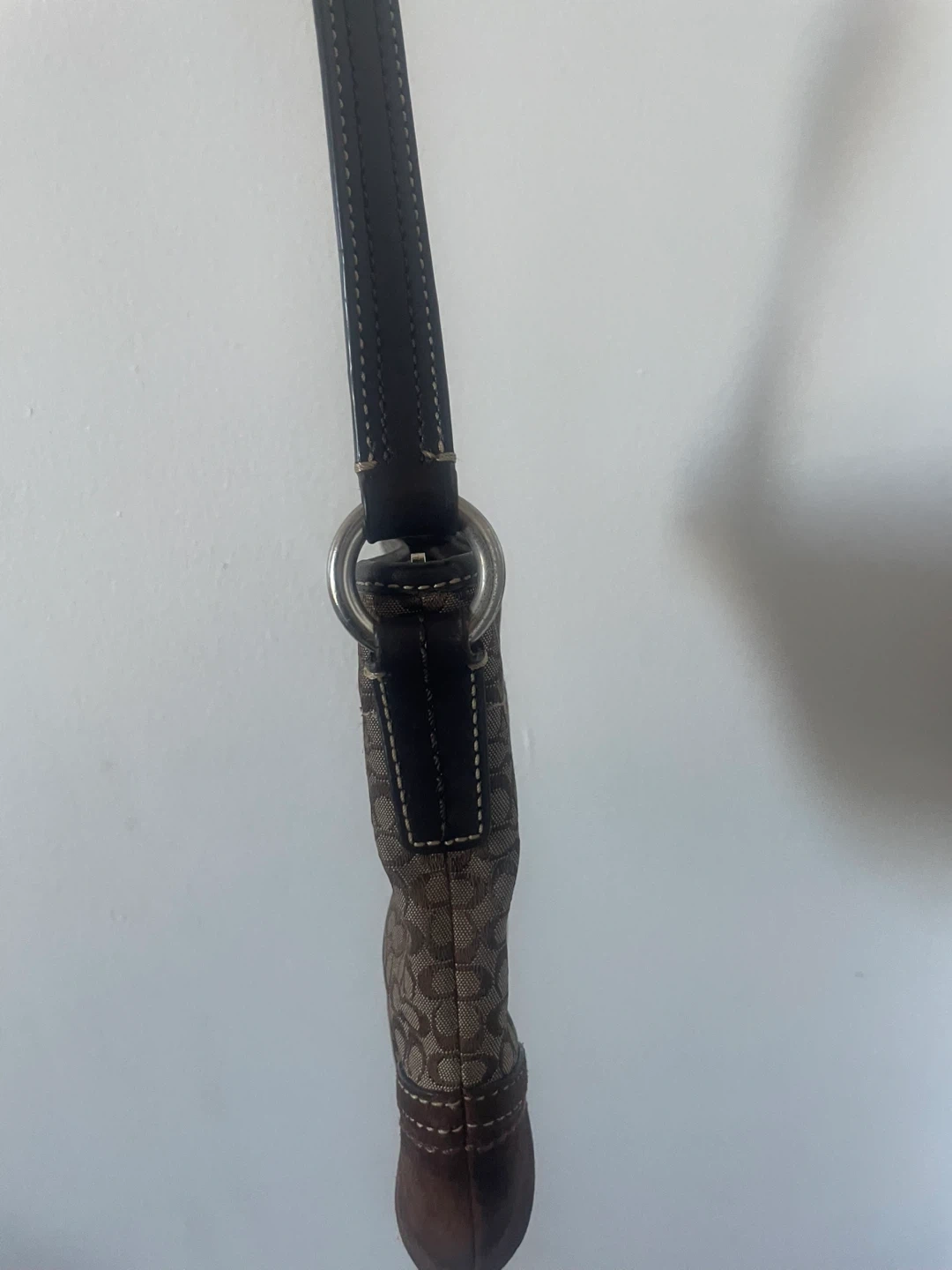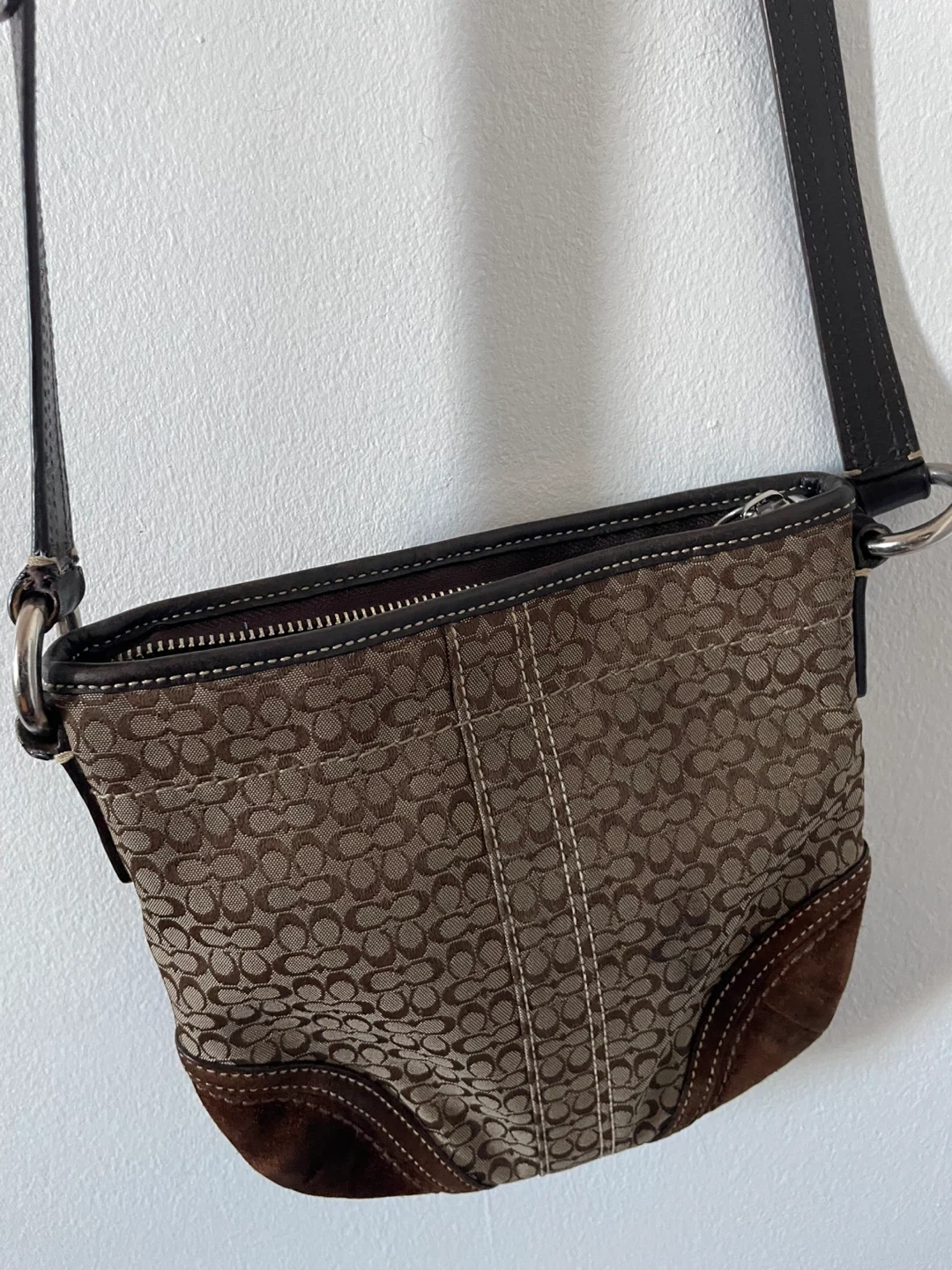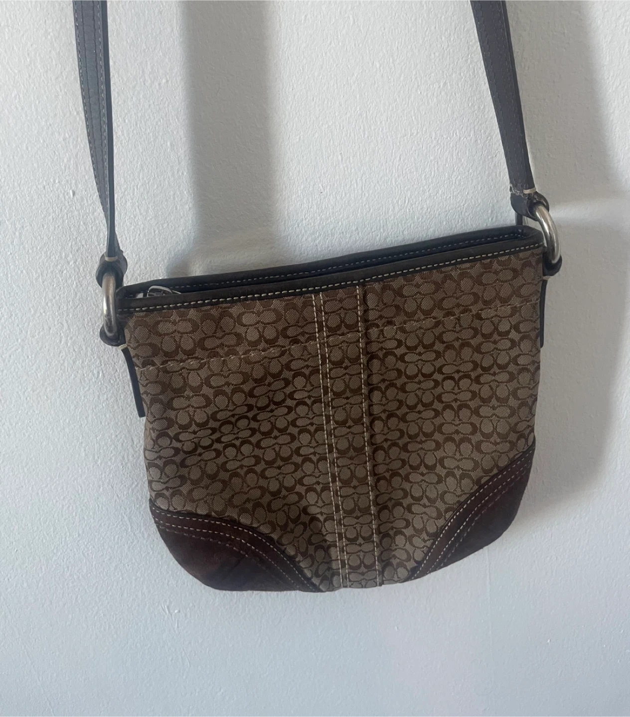 Selling a cute Coach crossbody bag! It features the classic Coach signature print in brown. The bag has a dark brown leather strap and trim. It's a great size for everyday use and is in good condition. ***it’s in pretty good condition but please look carefully for minor flaws