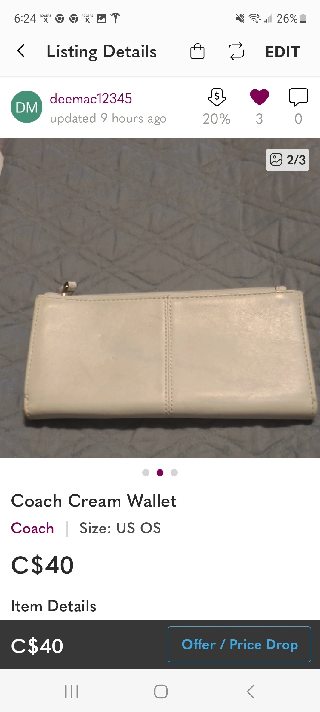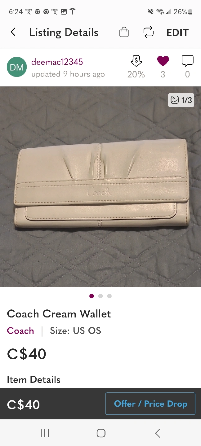 Selling a Coach cream wallet in great condition! The size is US OS.